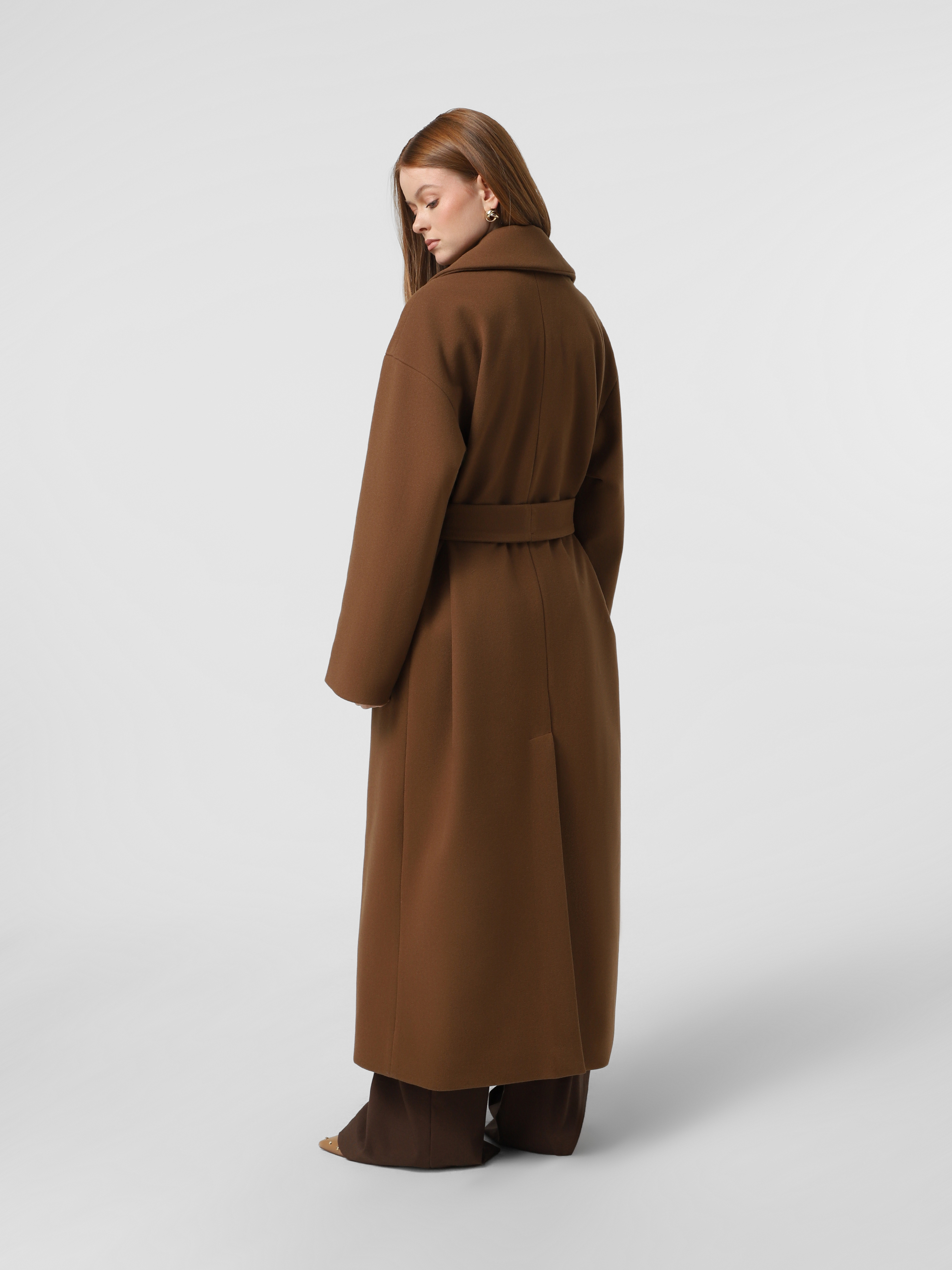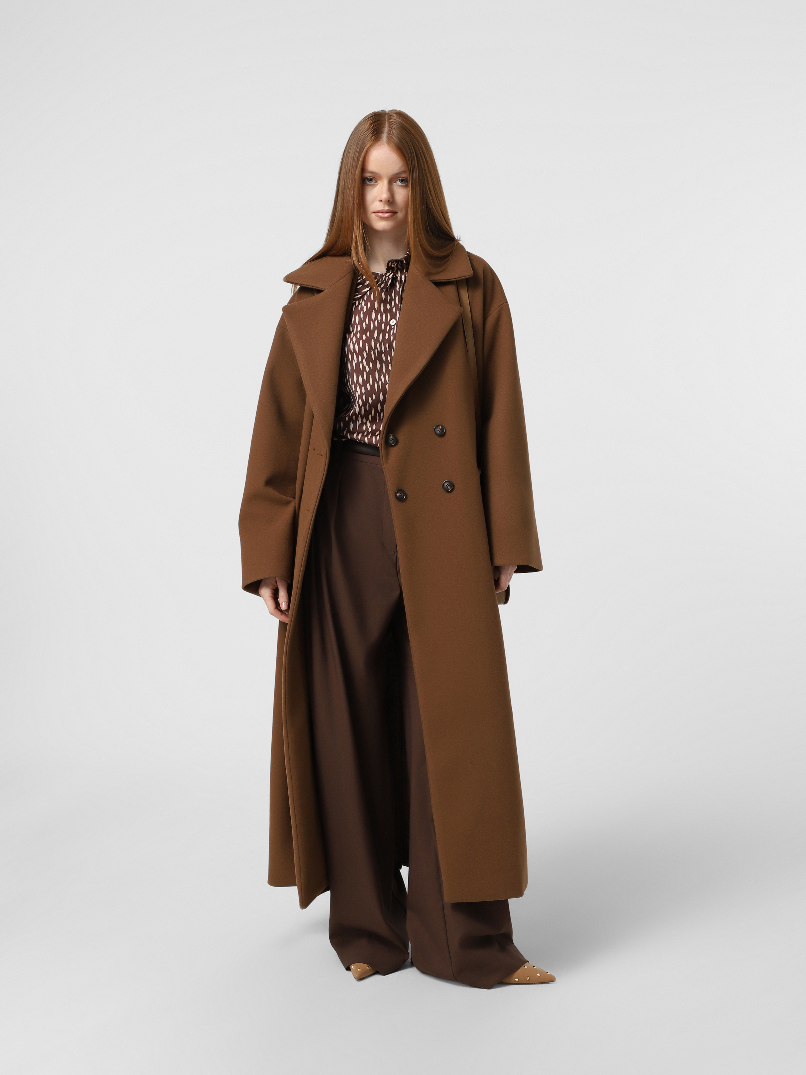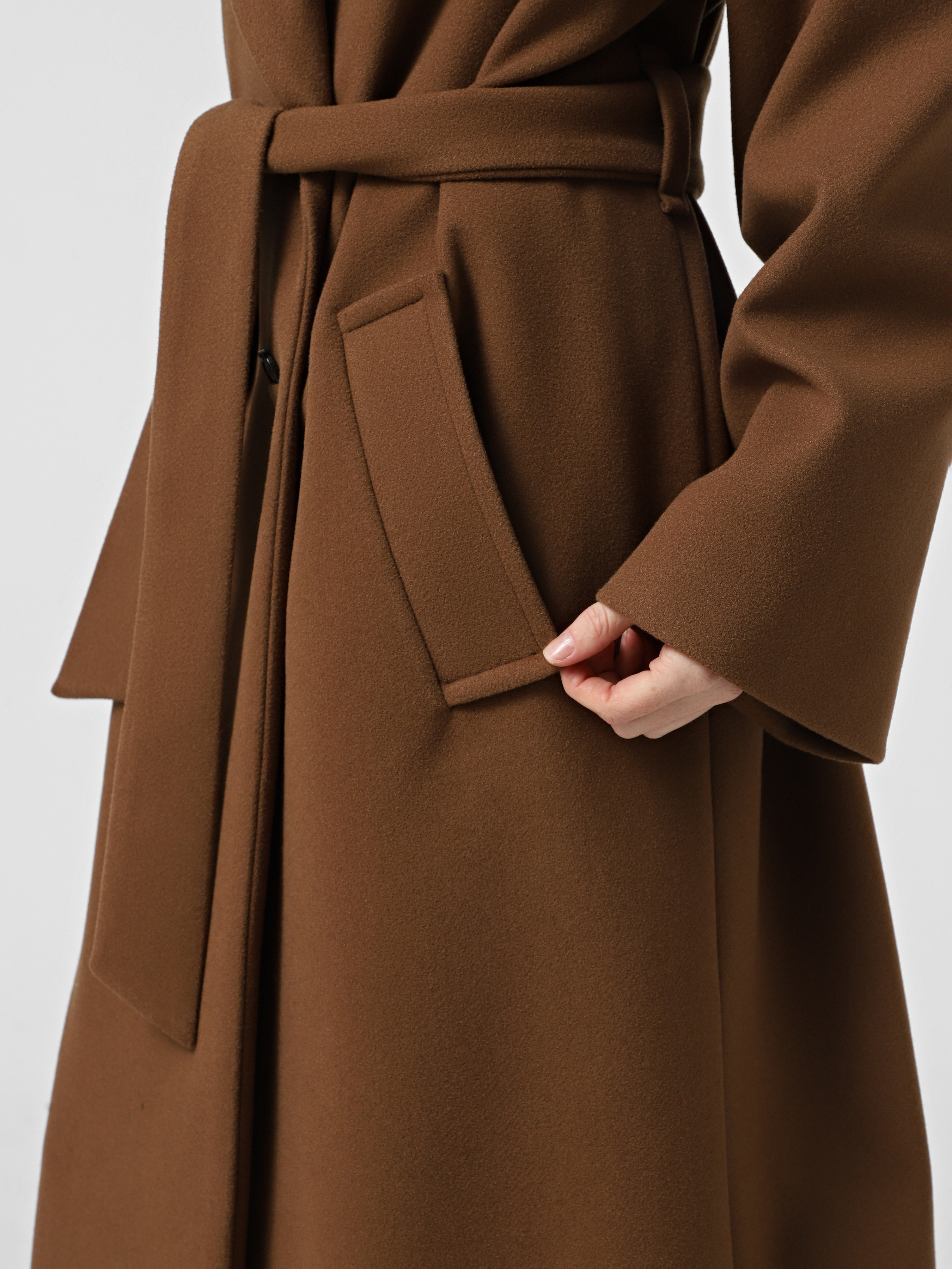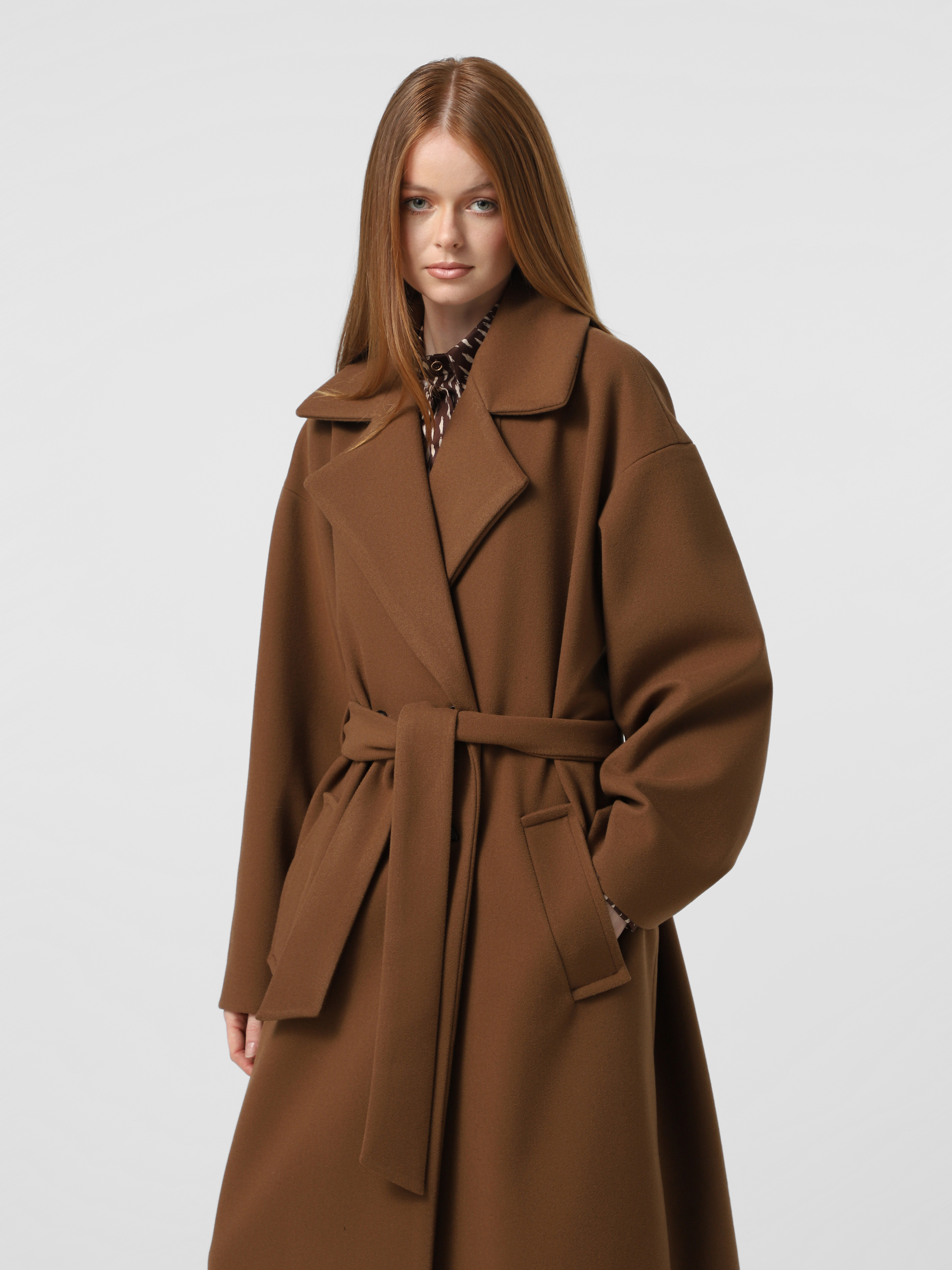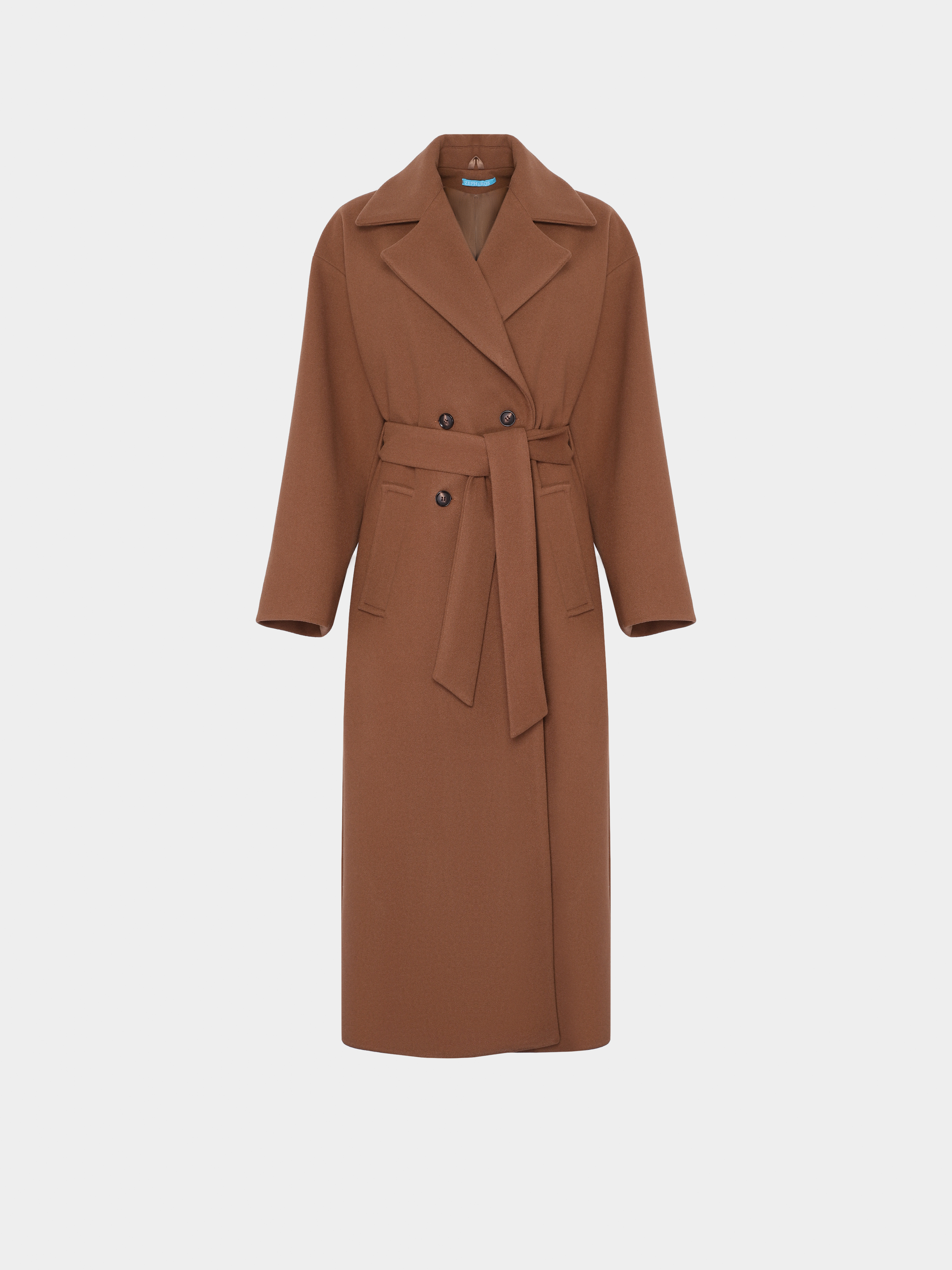 Дизайнерське елегантне двобортне кашемірове карамельне пальто, двобортне — 2 ряди ґудзиків у центрі. Зручні кишені. Ззаду передбачений шліц, що дає змогу не відчувати скутості рухів. Пояс у комплекті — красиво підкреслює талію. Пальто можна носити й без пояса для створення абсолютно нового образу.