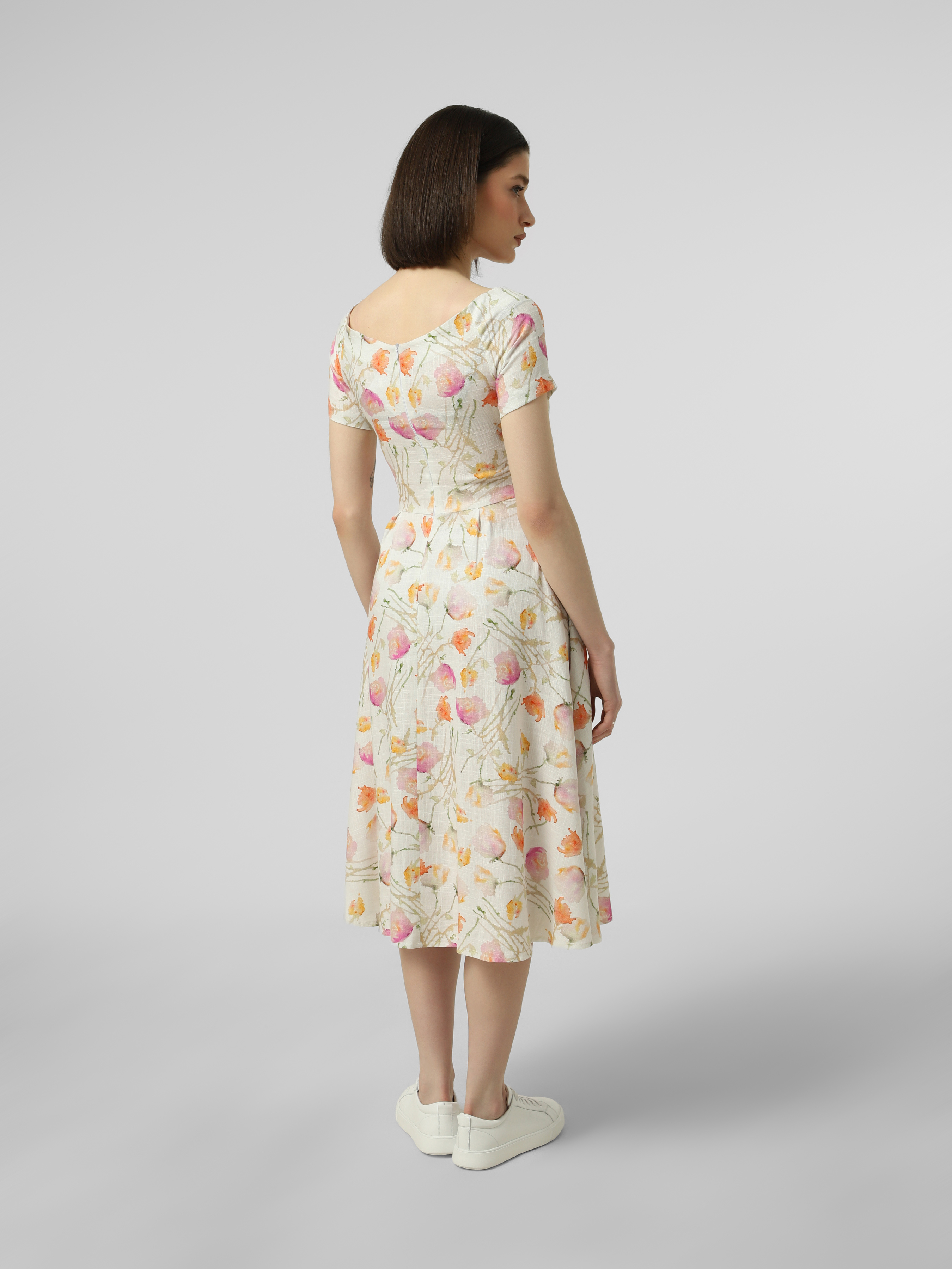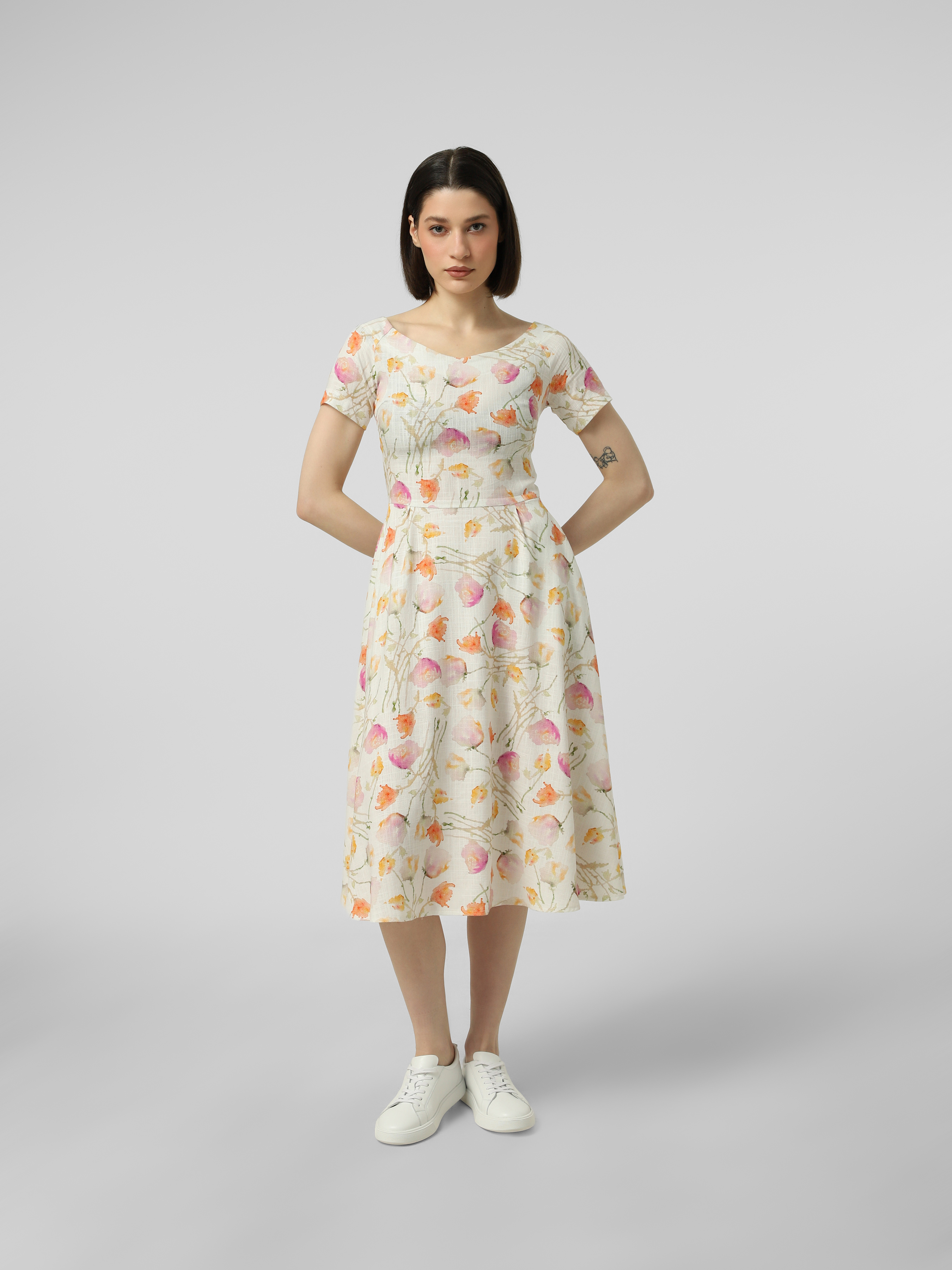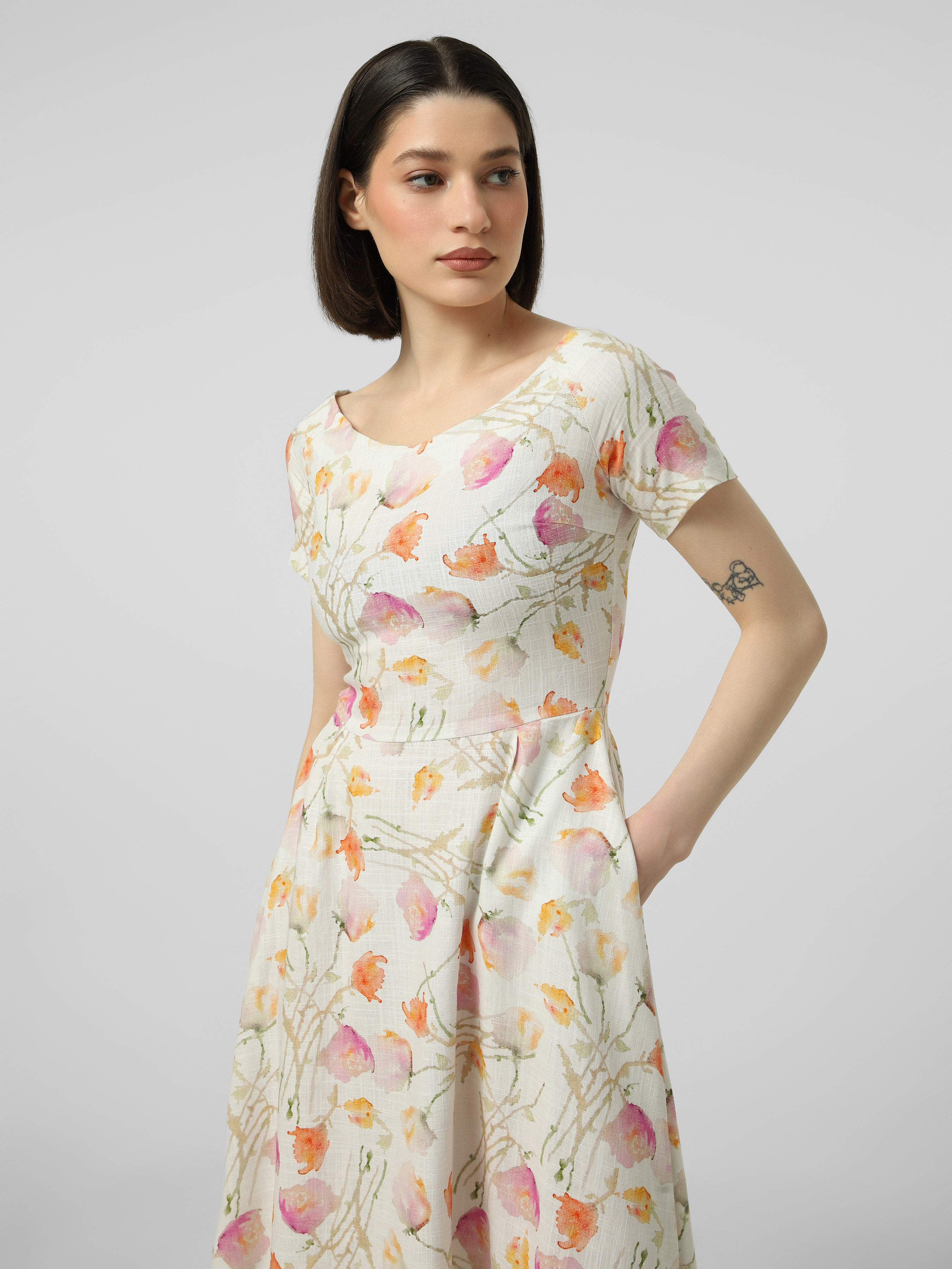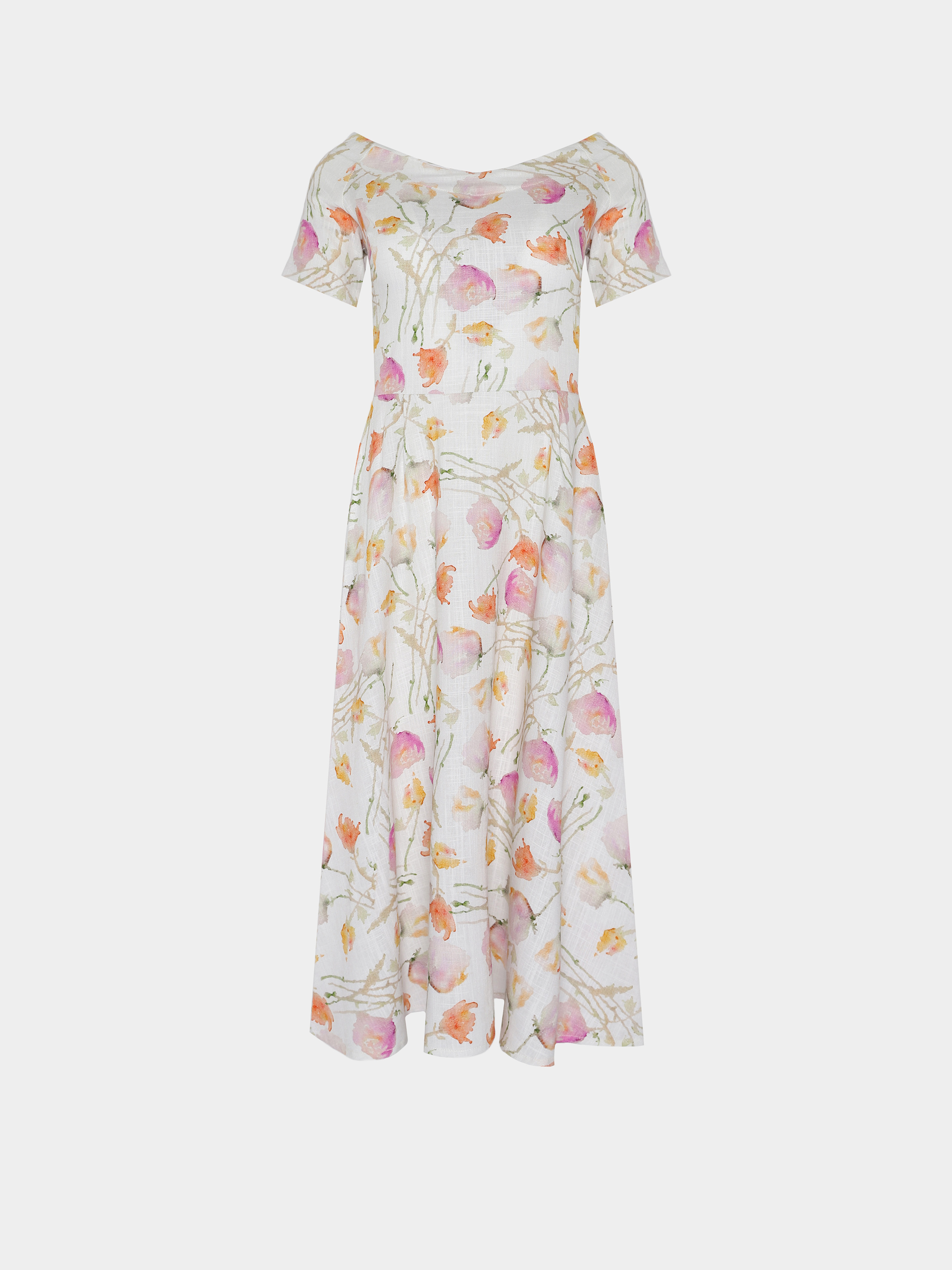 Сукня міді із принтованого льону з вирізом човником. Виріб застібається на приховану блискавку на спині.