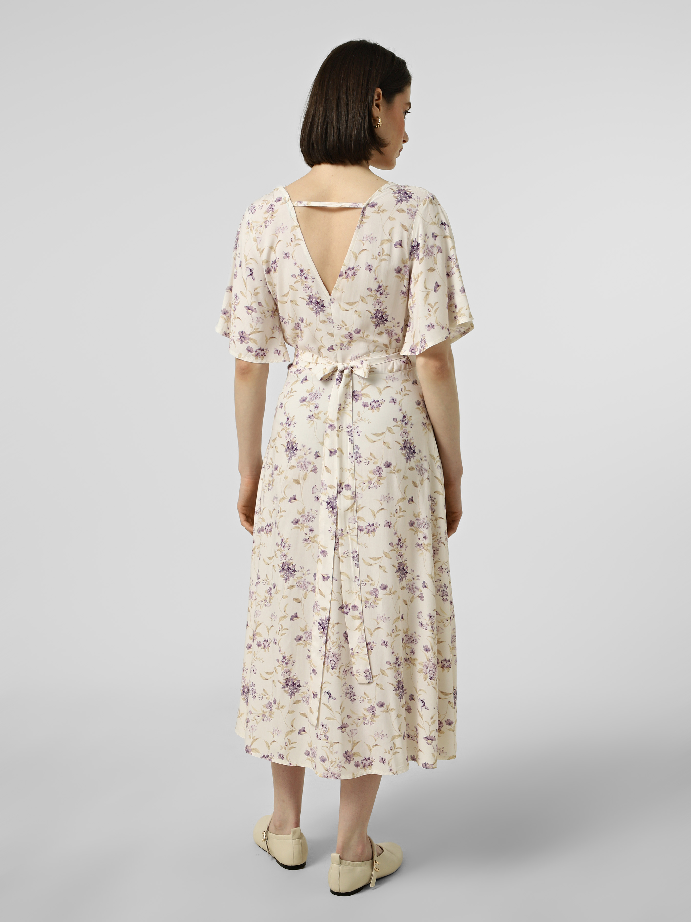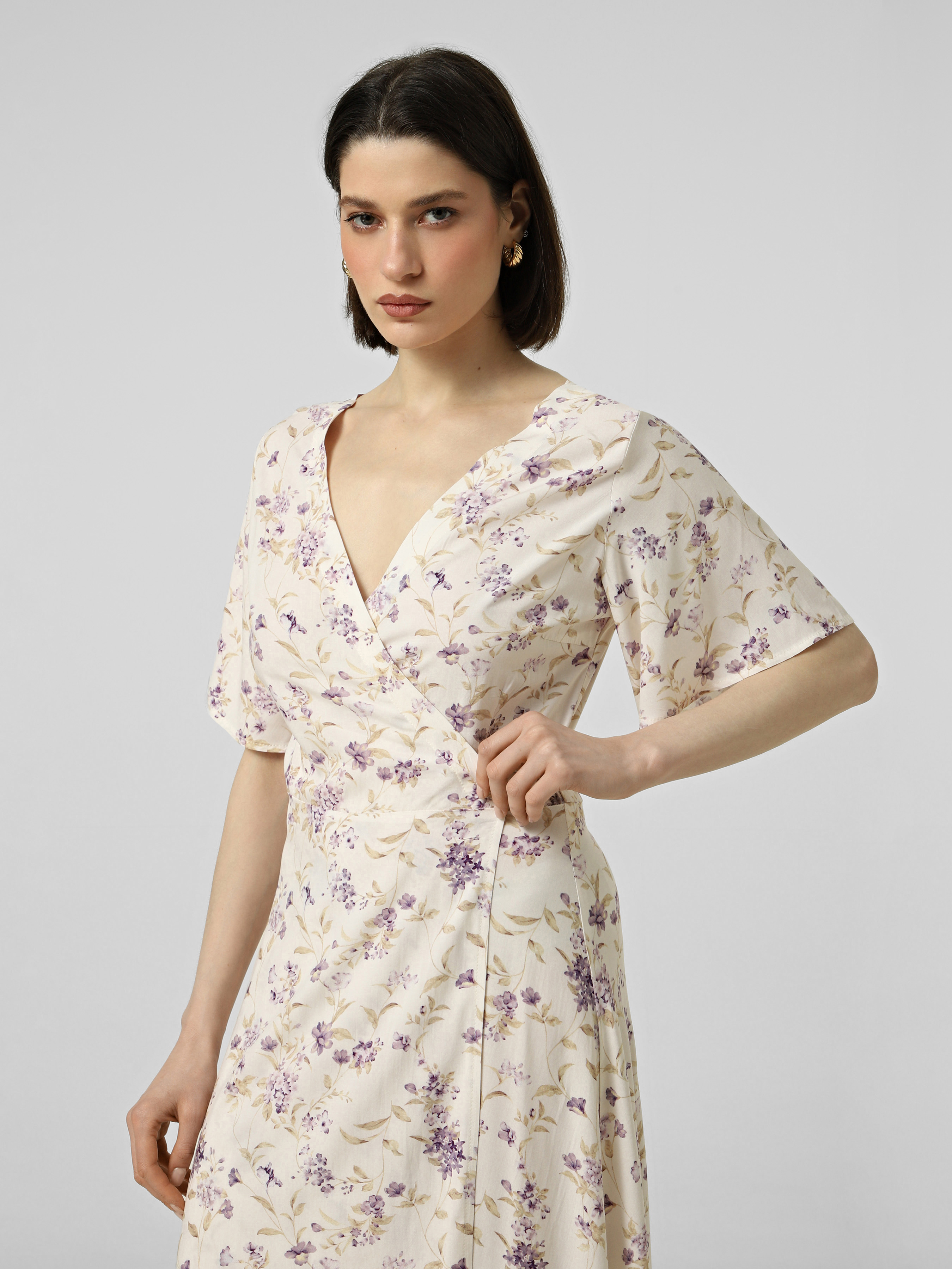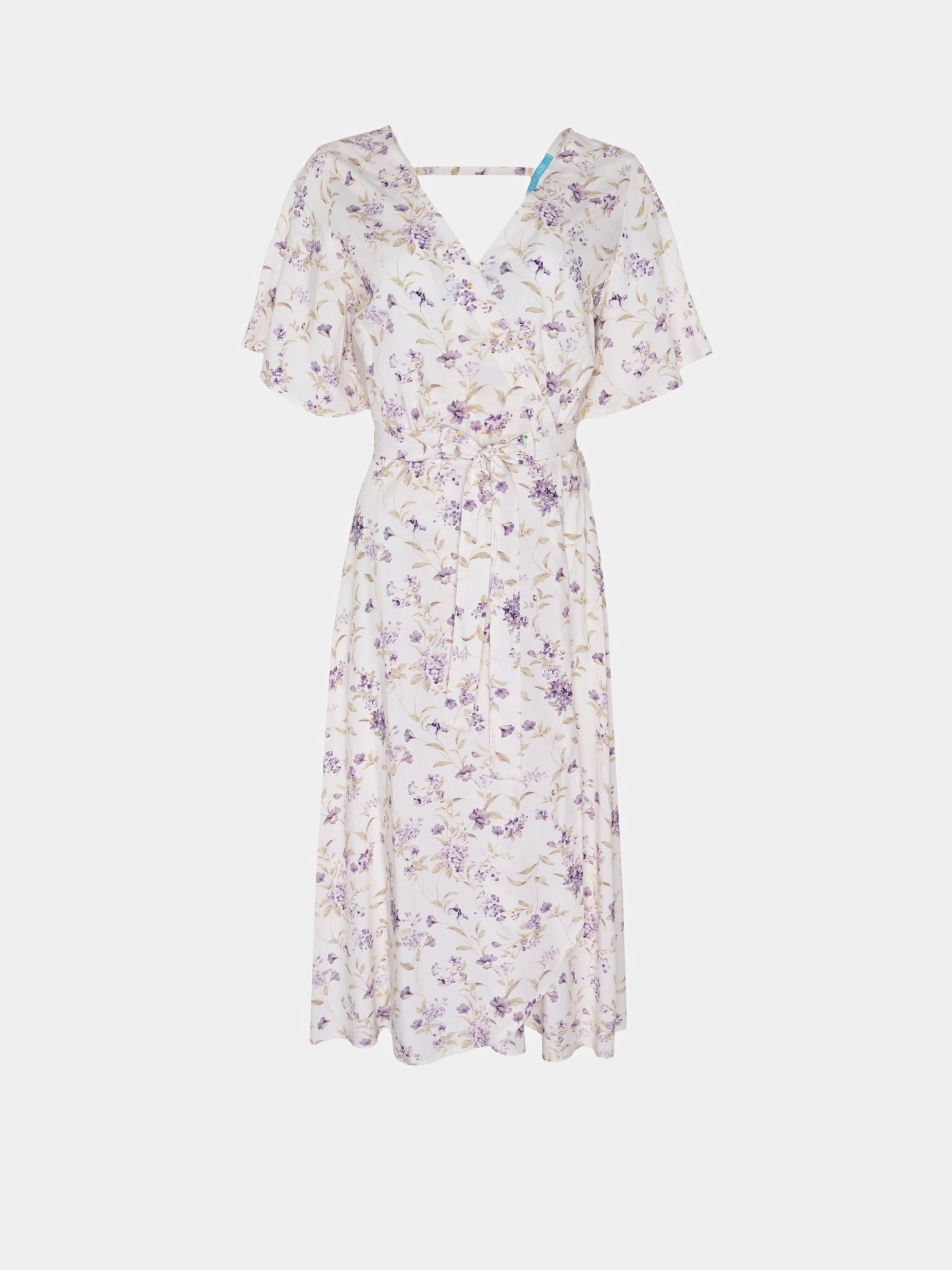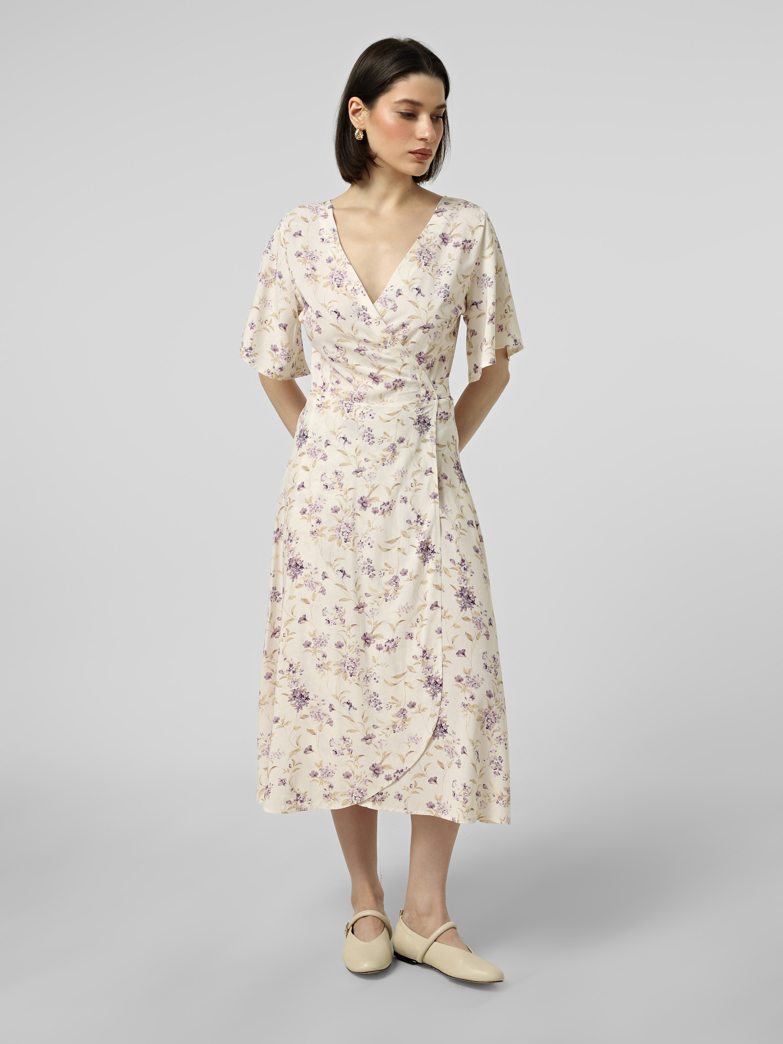 Легка сукня на запах з квітковим принтом, з V-подібним вирізом спереду і ззаду, з повітряними, короткими рукавами, довжини міді.