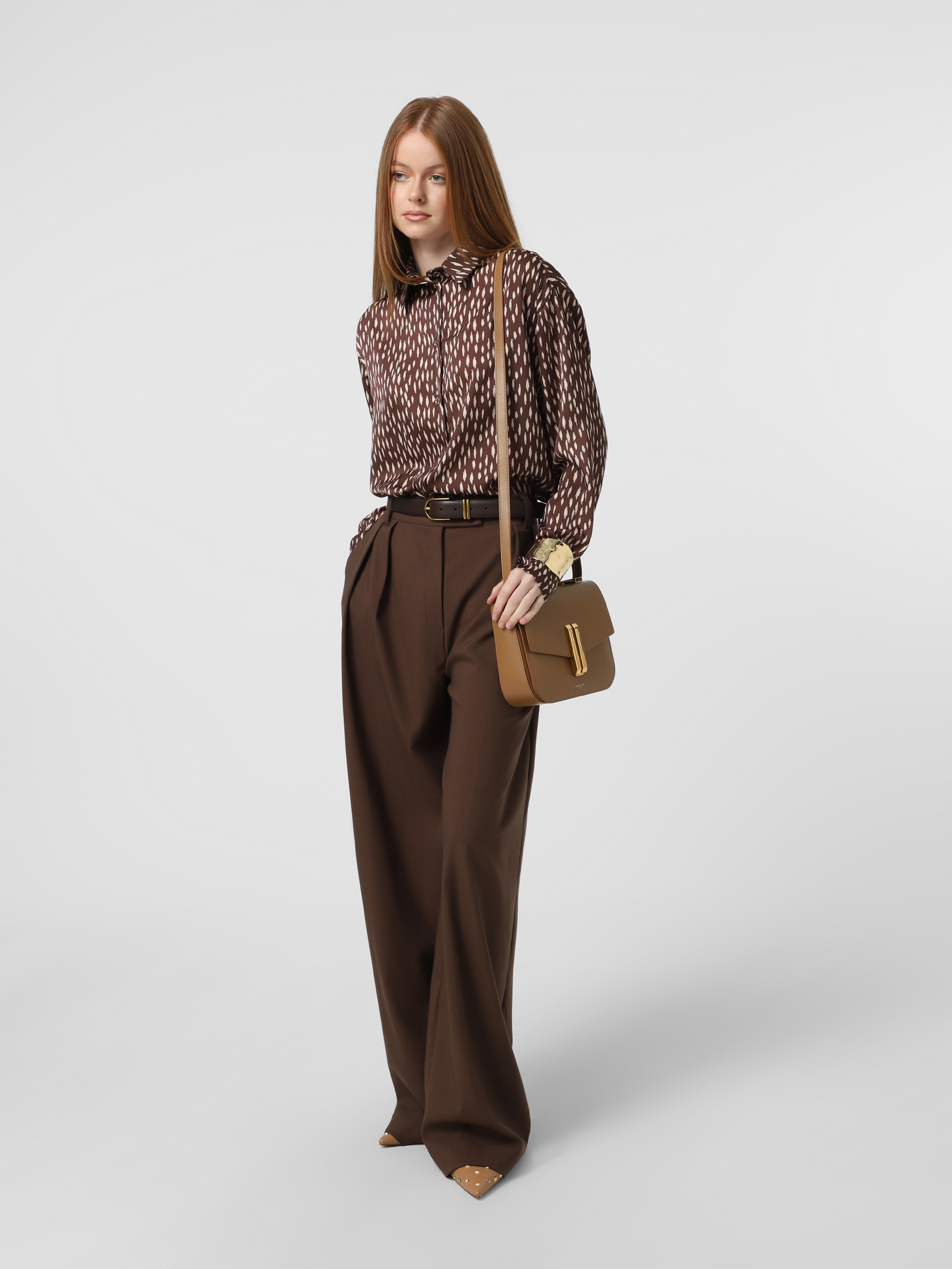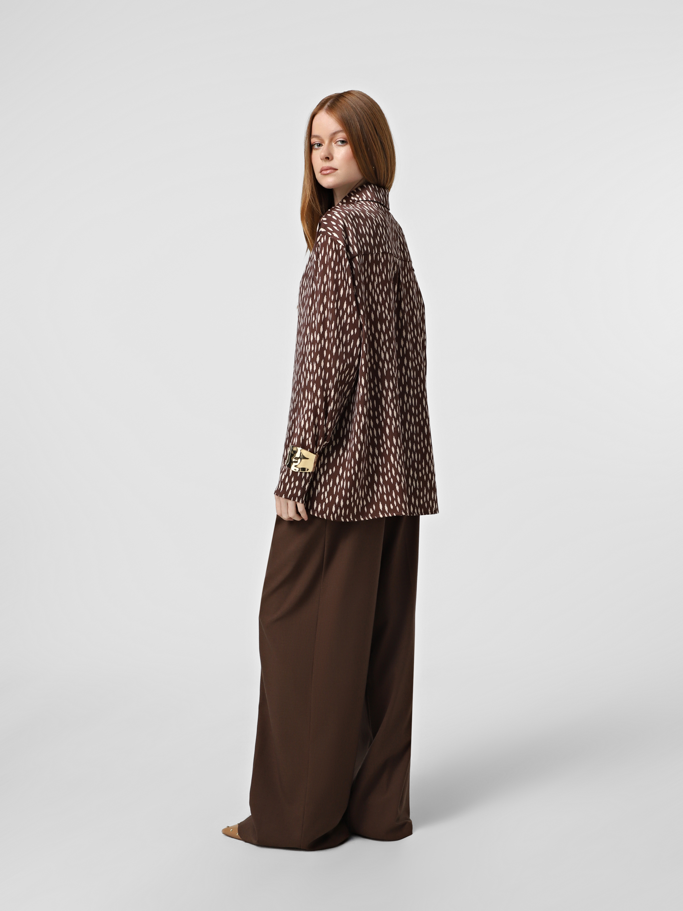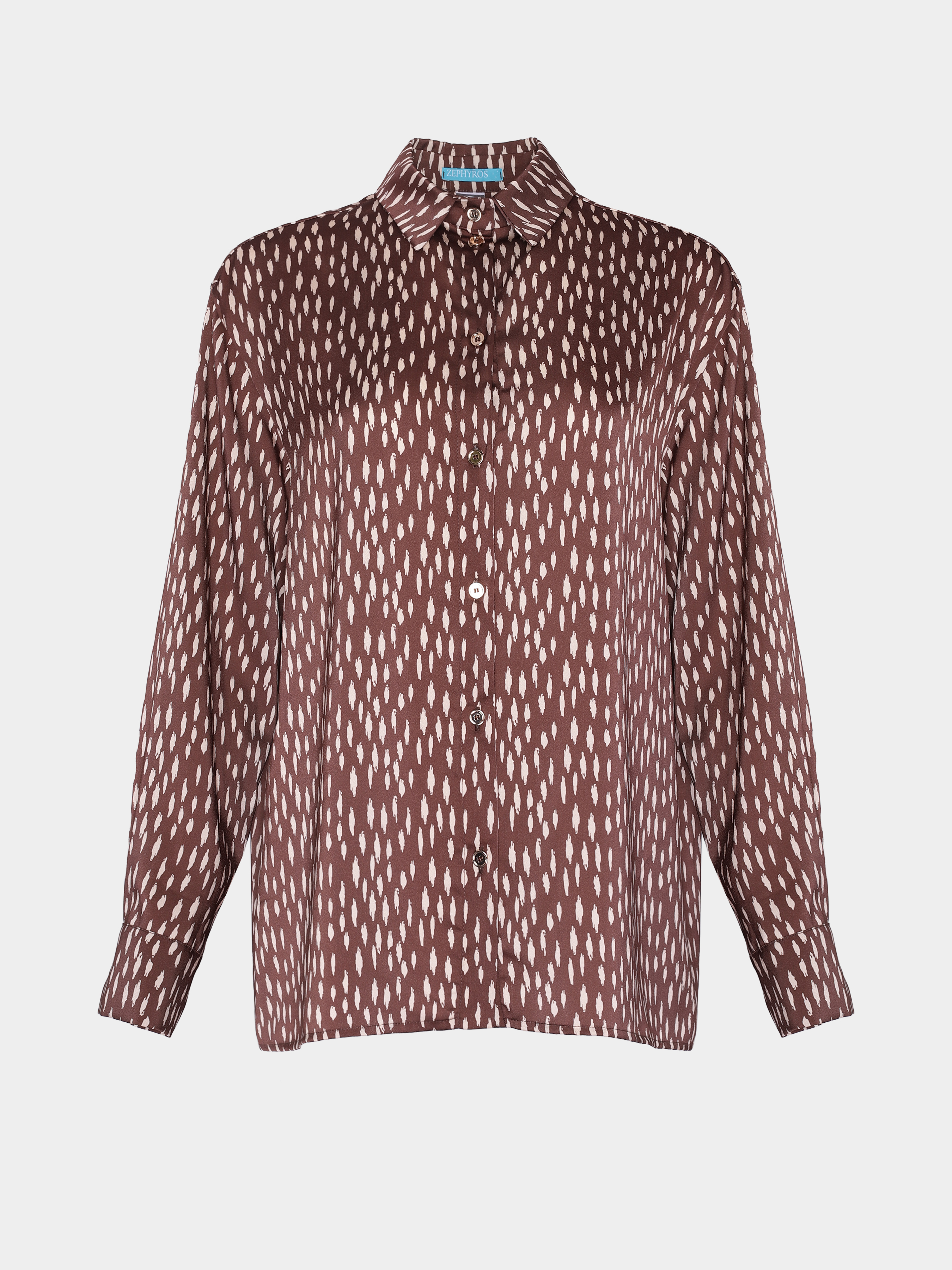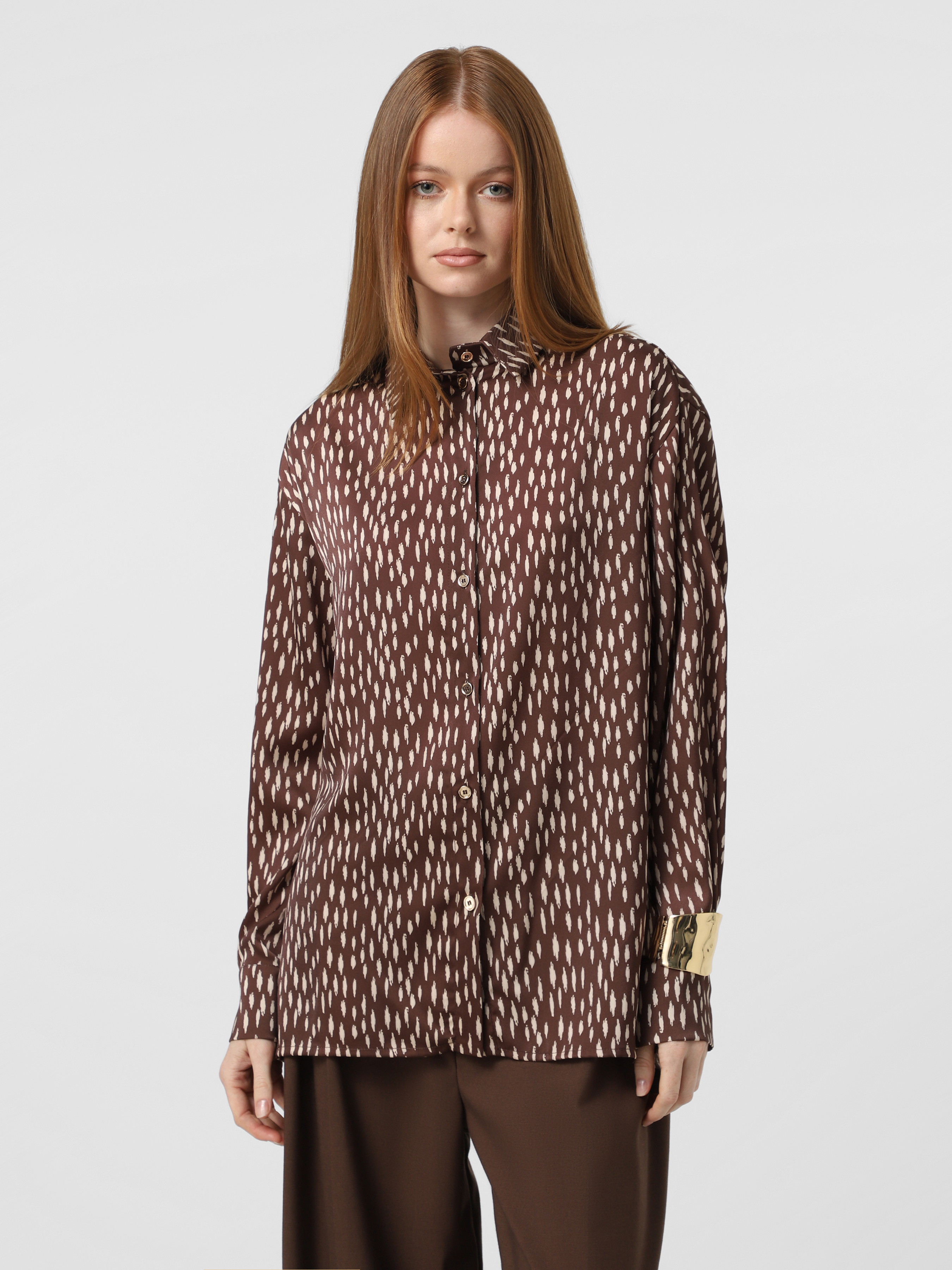 Шоколадна шовкова сорочка Штрихи в стилі oversize, застібається на золоті металеві гудзики, без розрізів по боках.