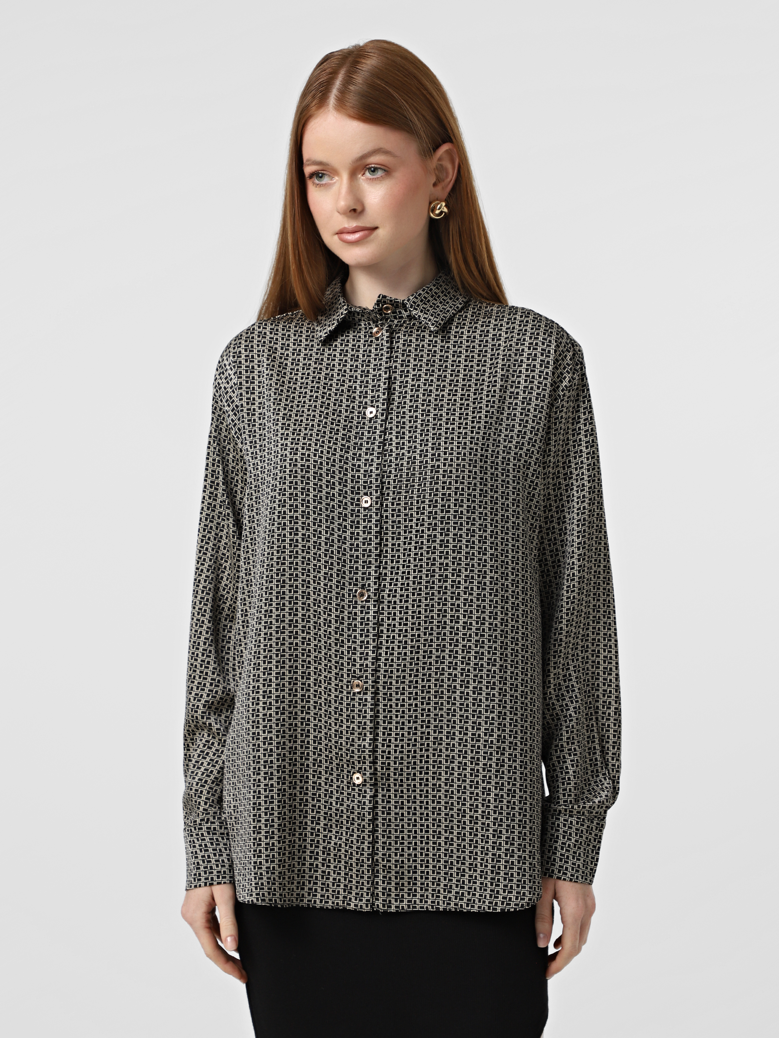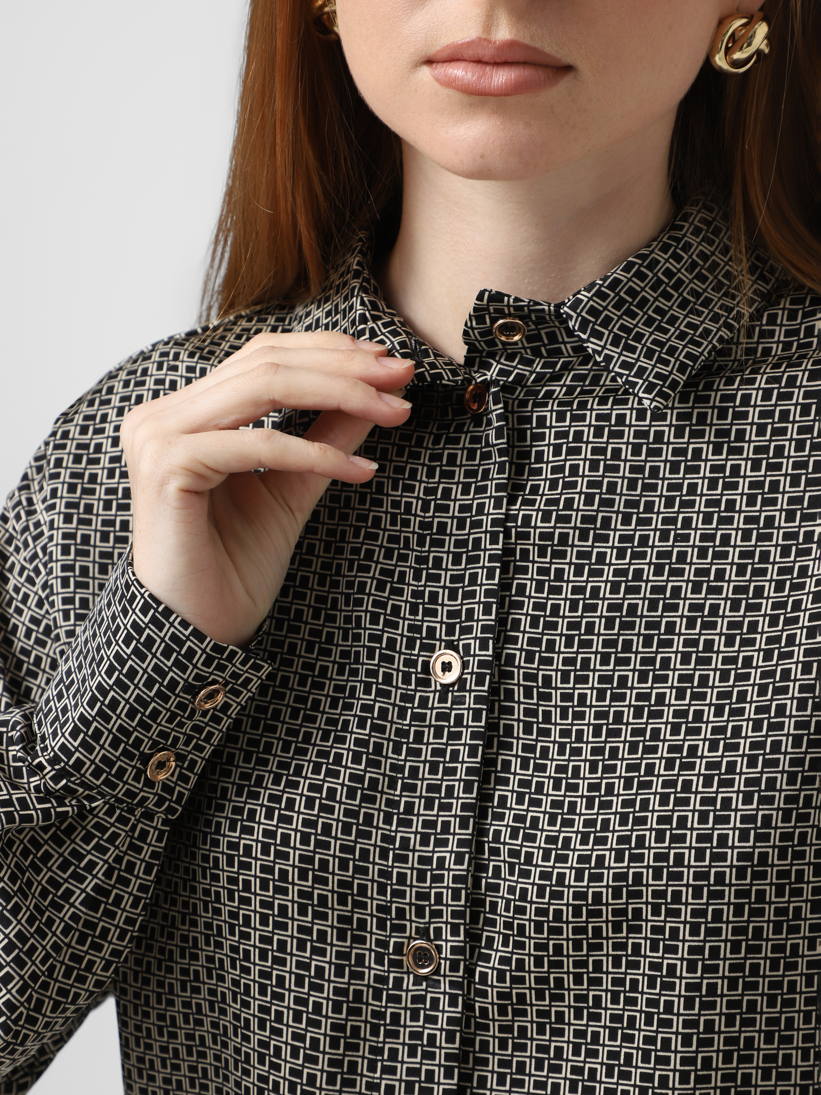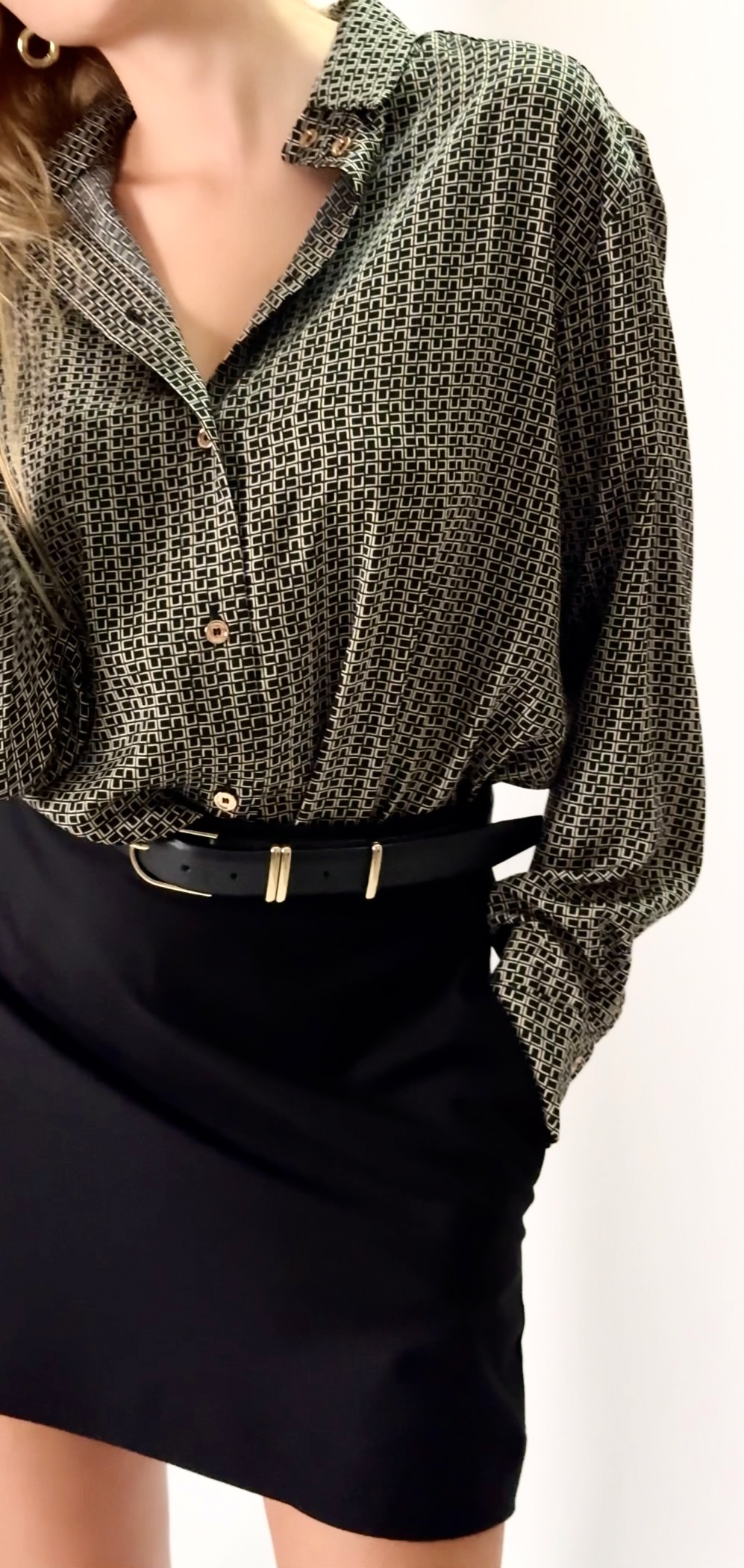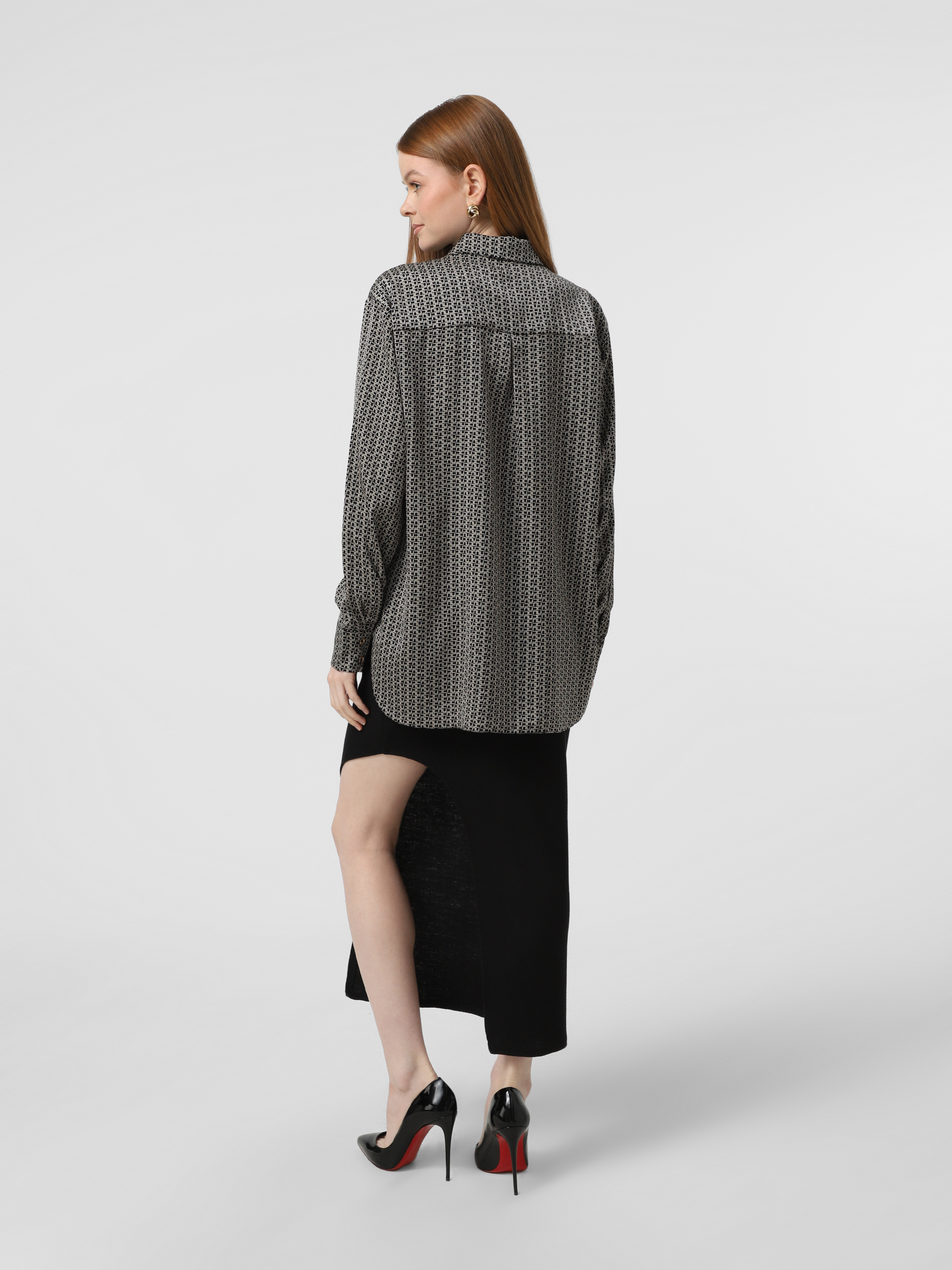 Чорна шовкова сорочка Лабіринти в стилі oversize, застібається на золоті металеві гудзики, без розрізів по боках.