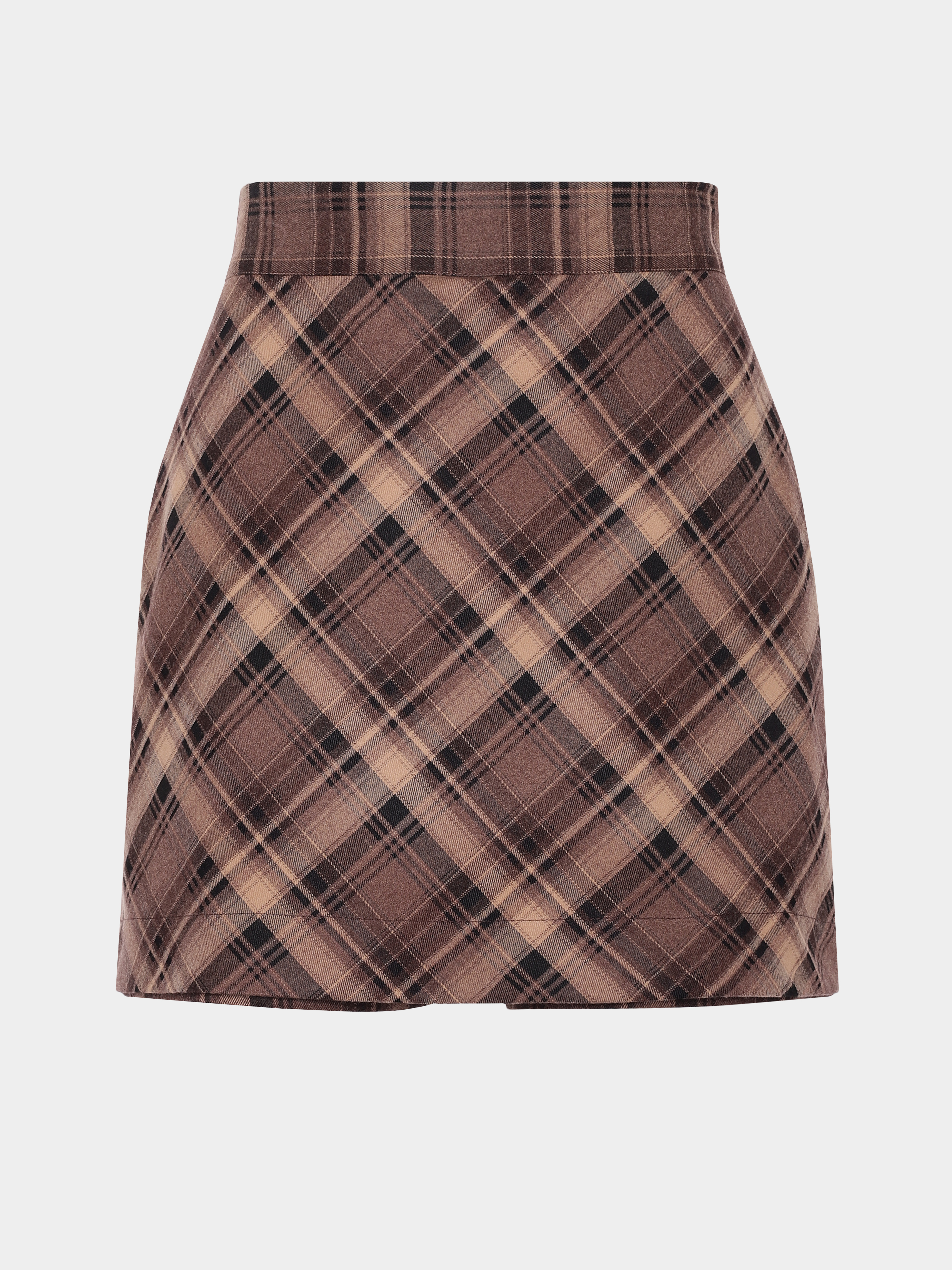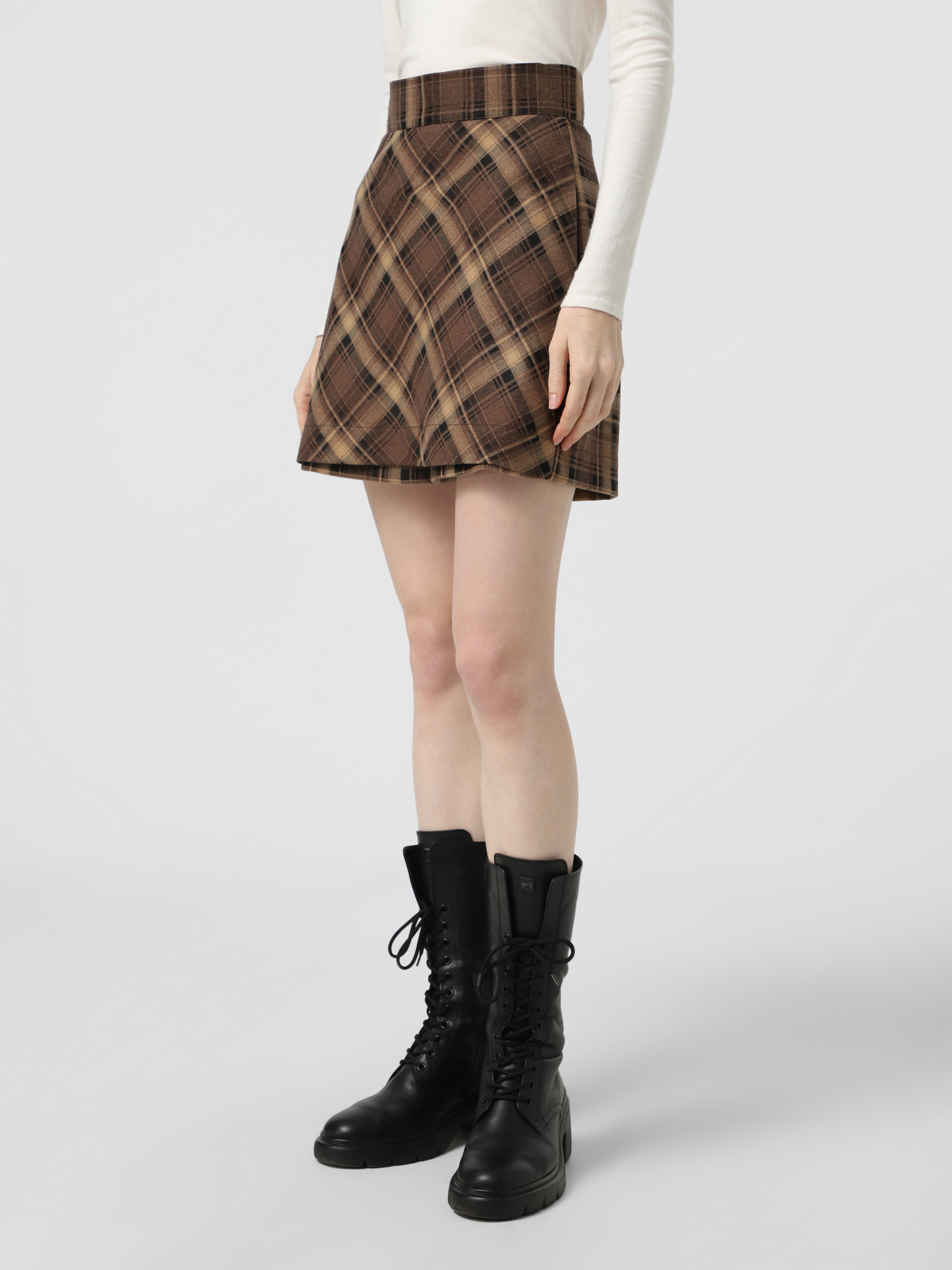 Карамельна спідниця-шорти в чорну клітинку з кишенями в бічних швах, середньої посадки, застібається на приховану блискавку.
