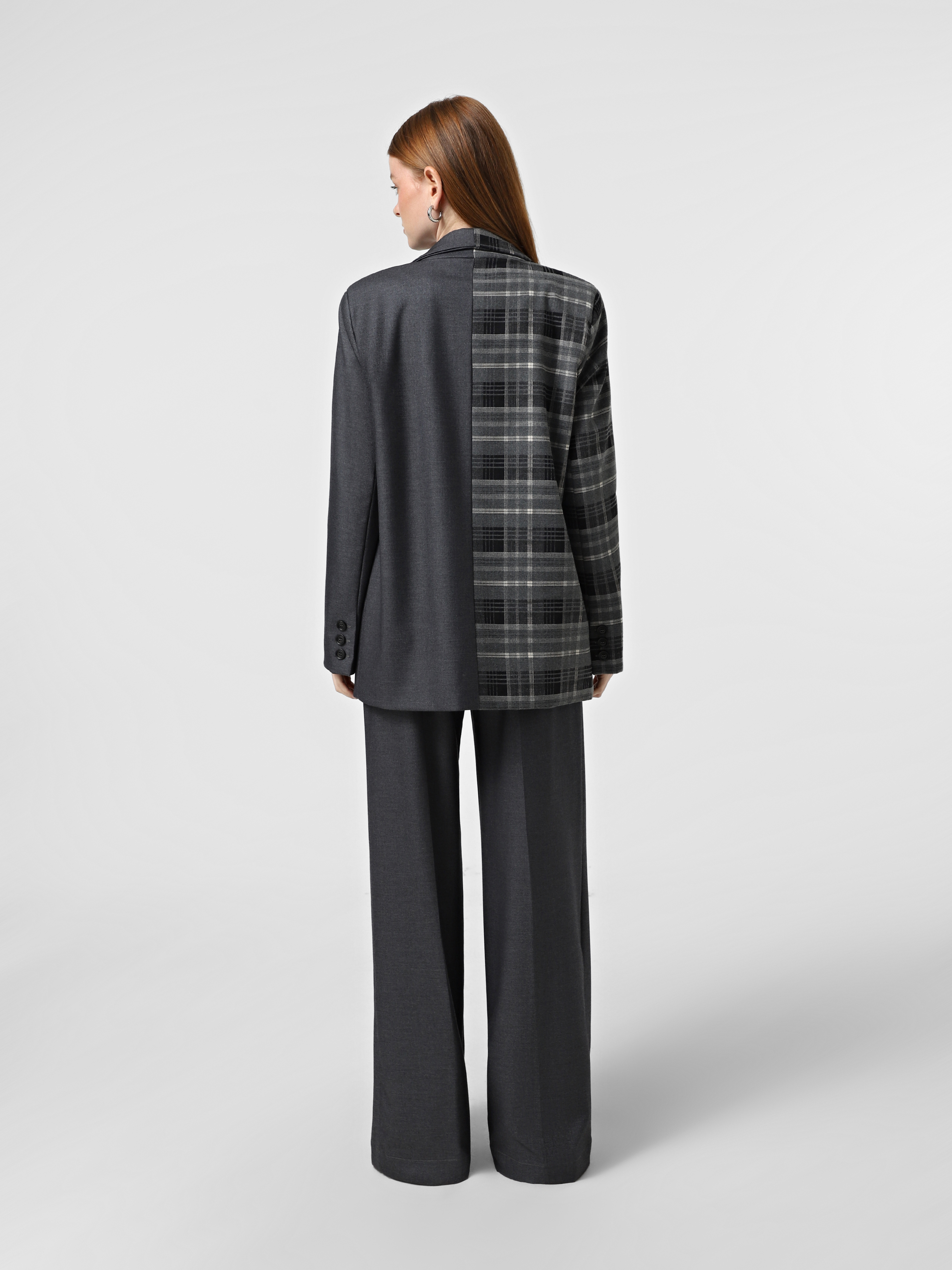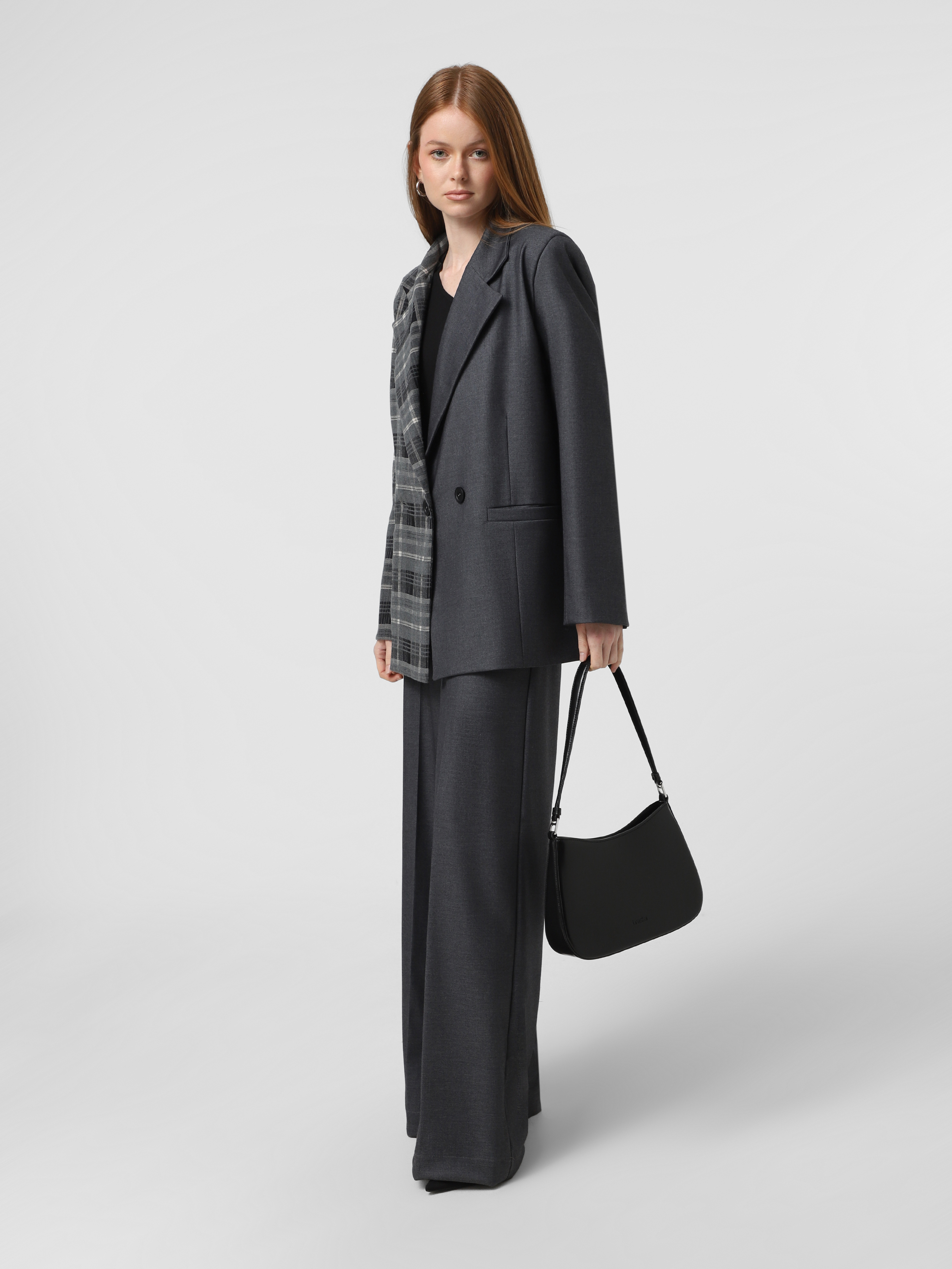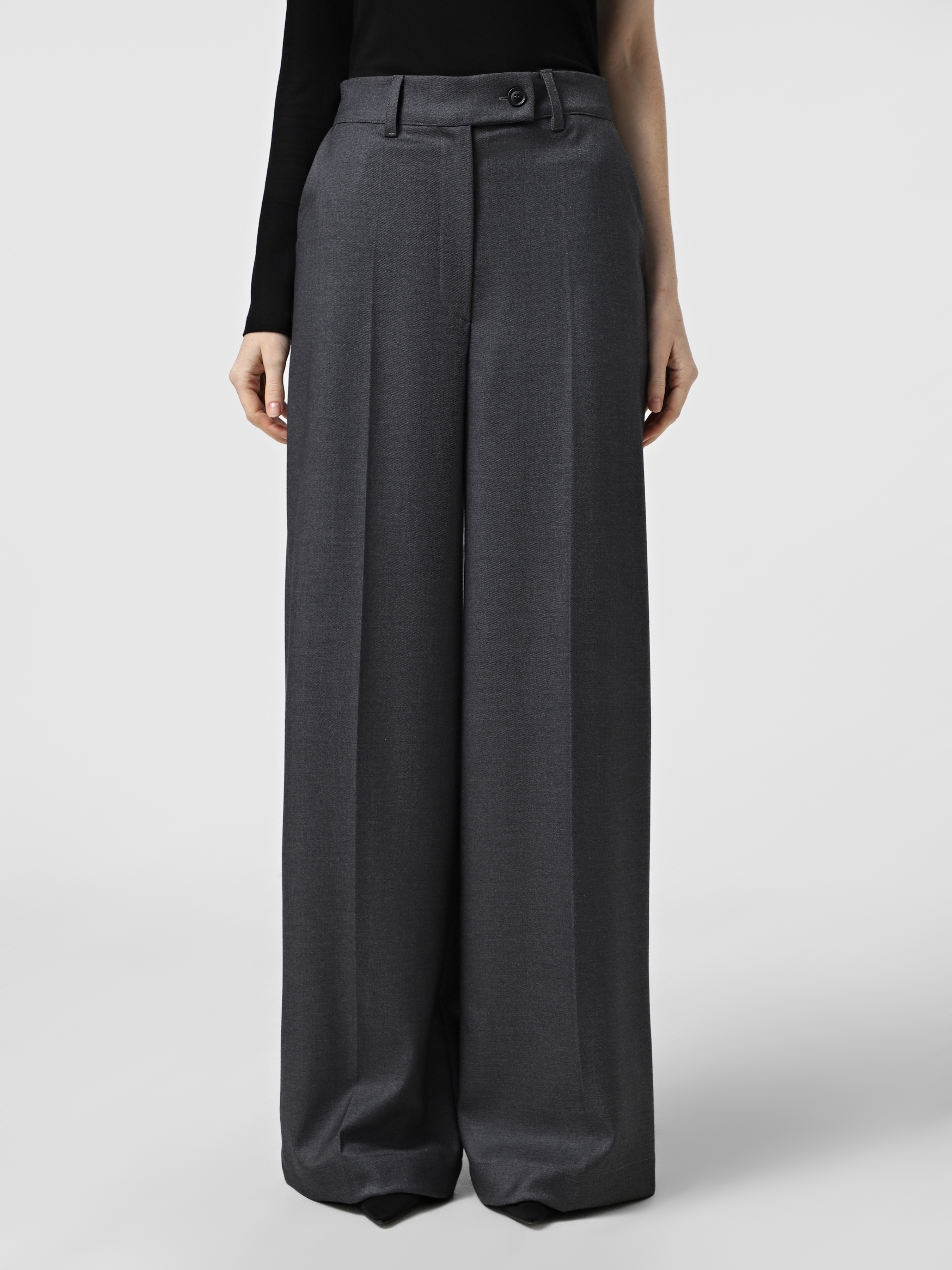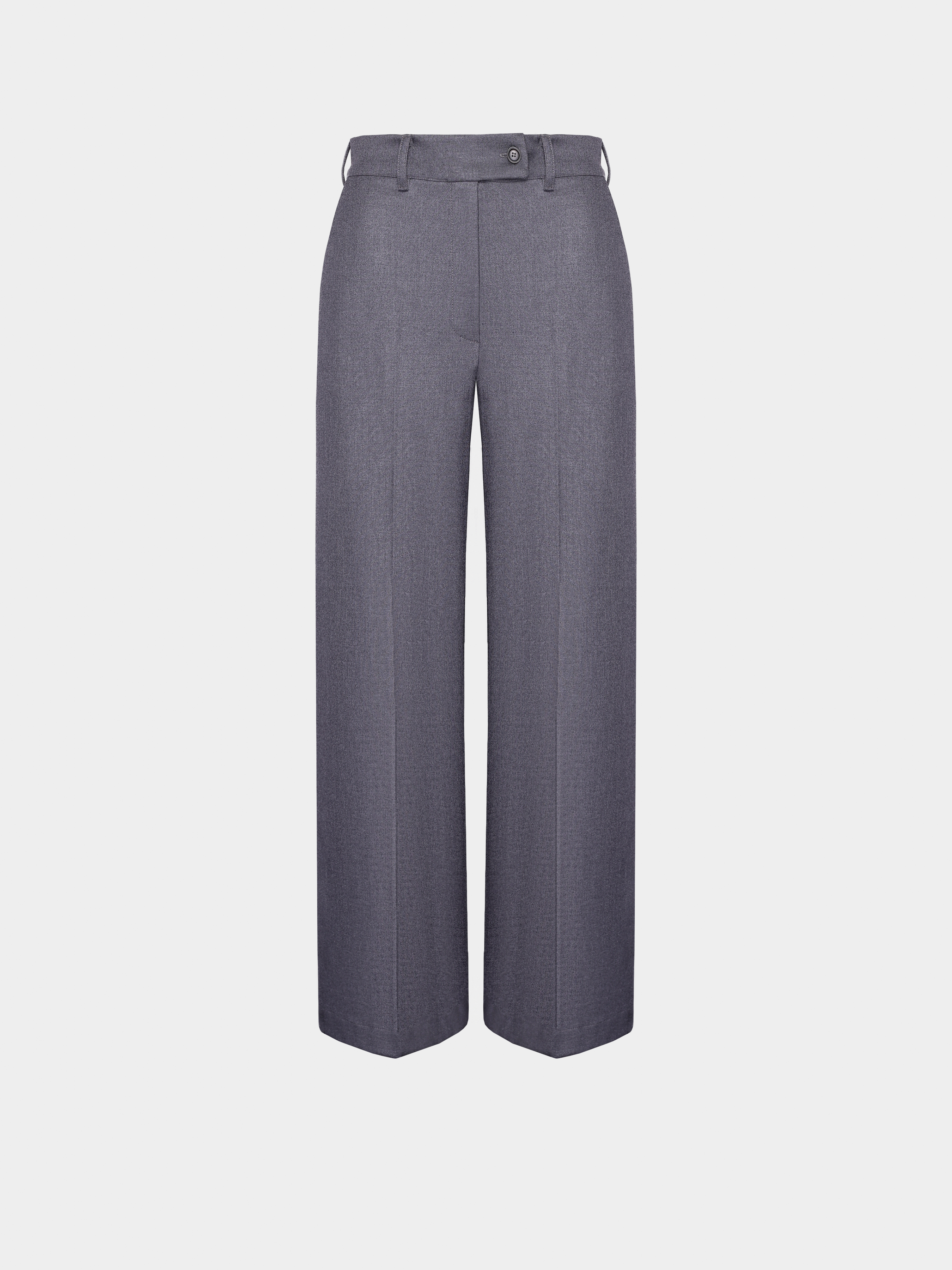 Сірі прямі брюки з костюмної тканини - елегантний силует, прямий вільний крій, з високою посадкою, стильний вибір для різних образів. Застібаються на гудзик і блискавку, мають бічні кишені для зручності та шльовки на поясі для ременя. Ззаду — декоративні кишені, що додають витончених деталей.