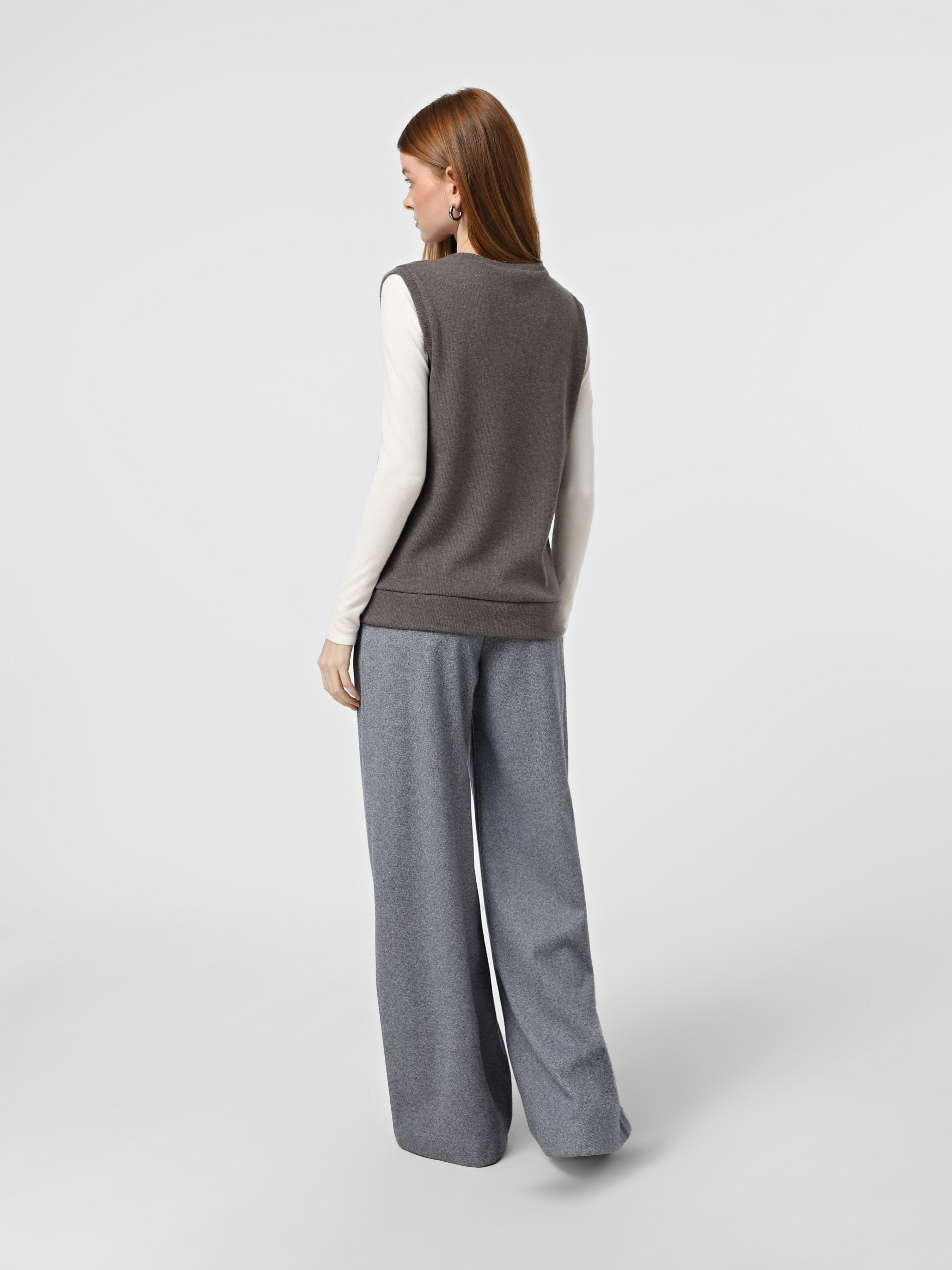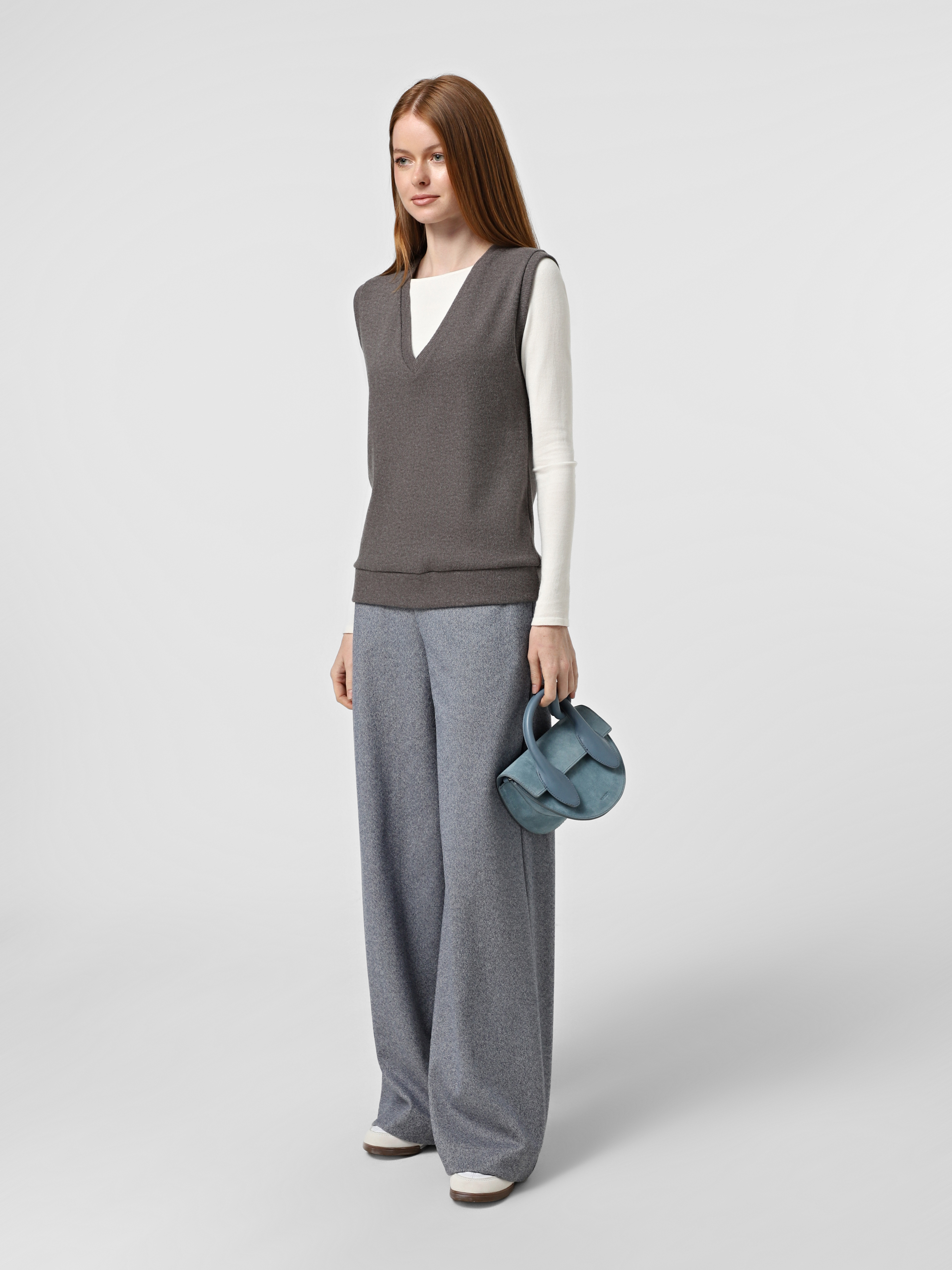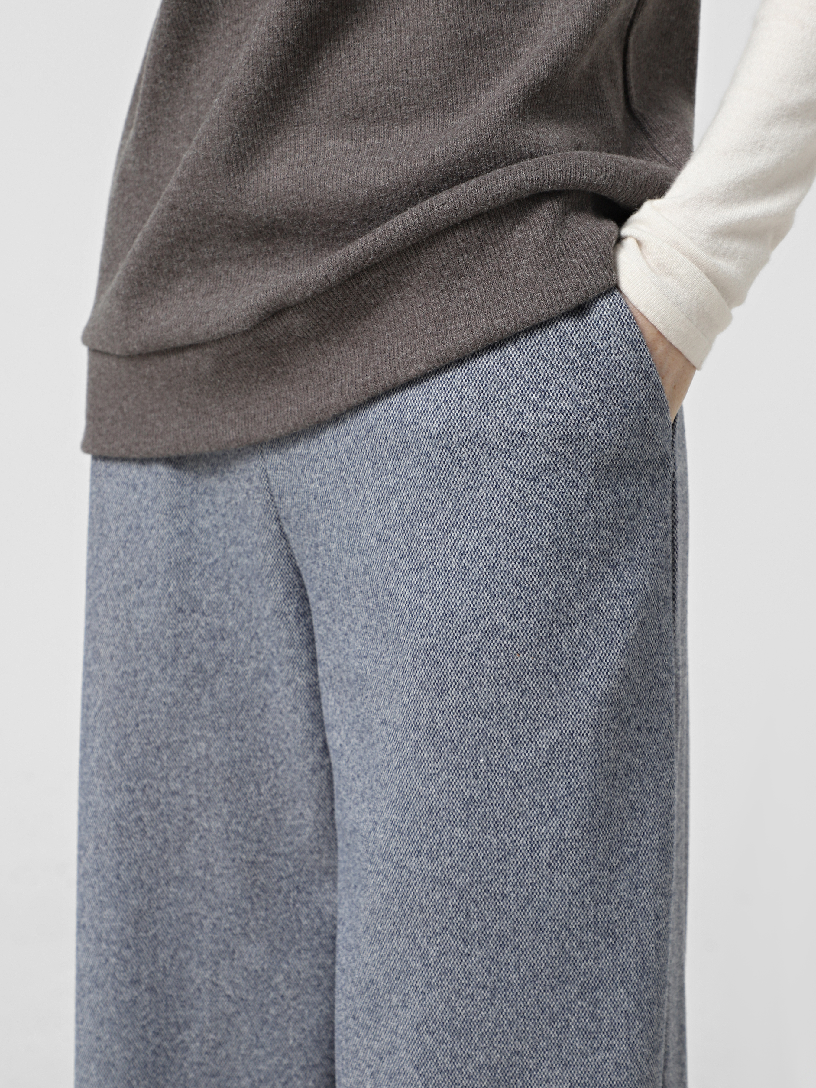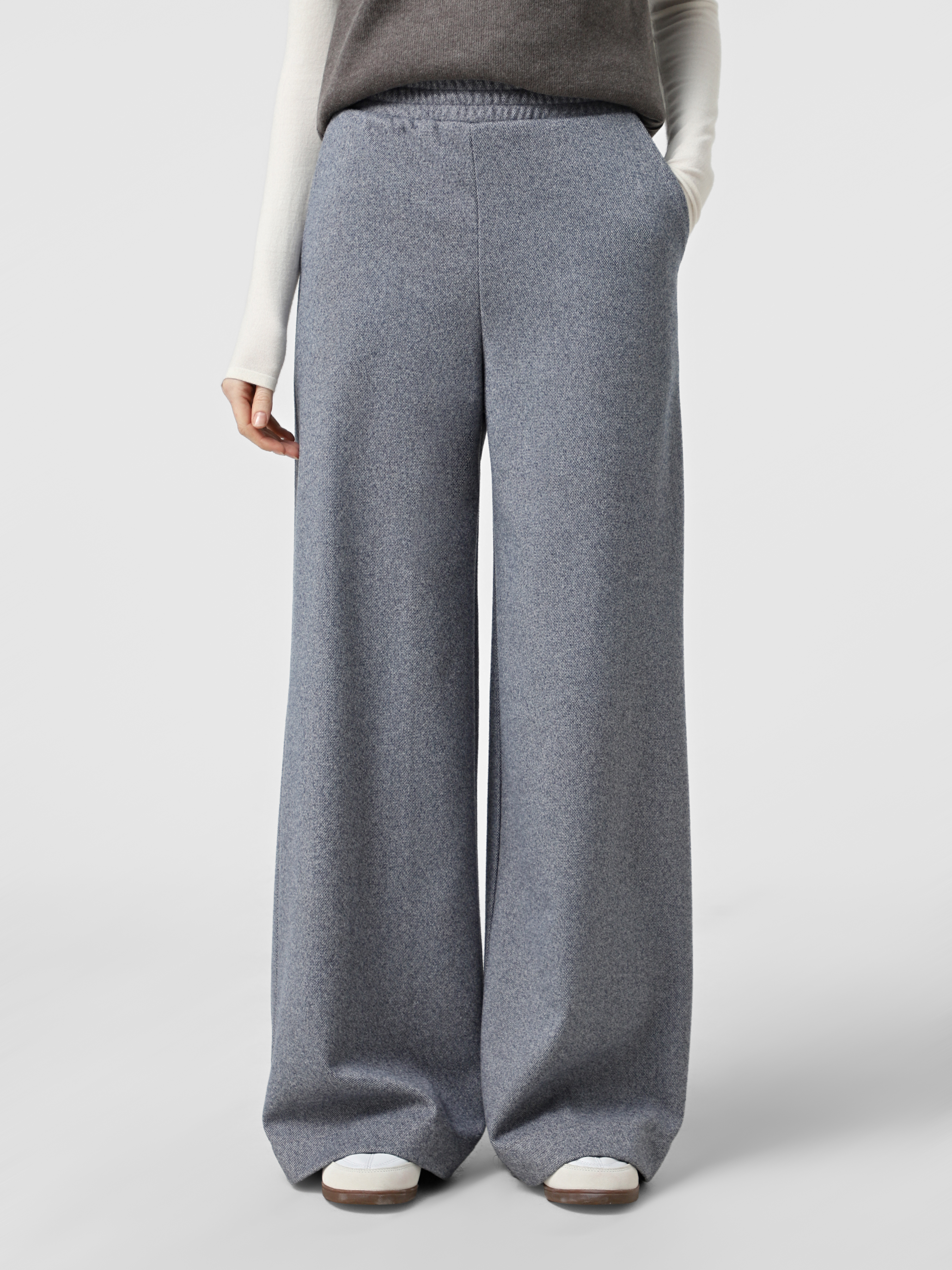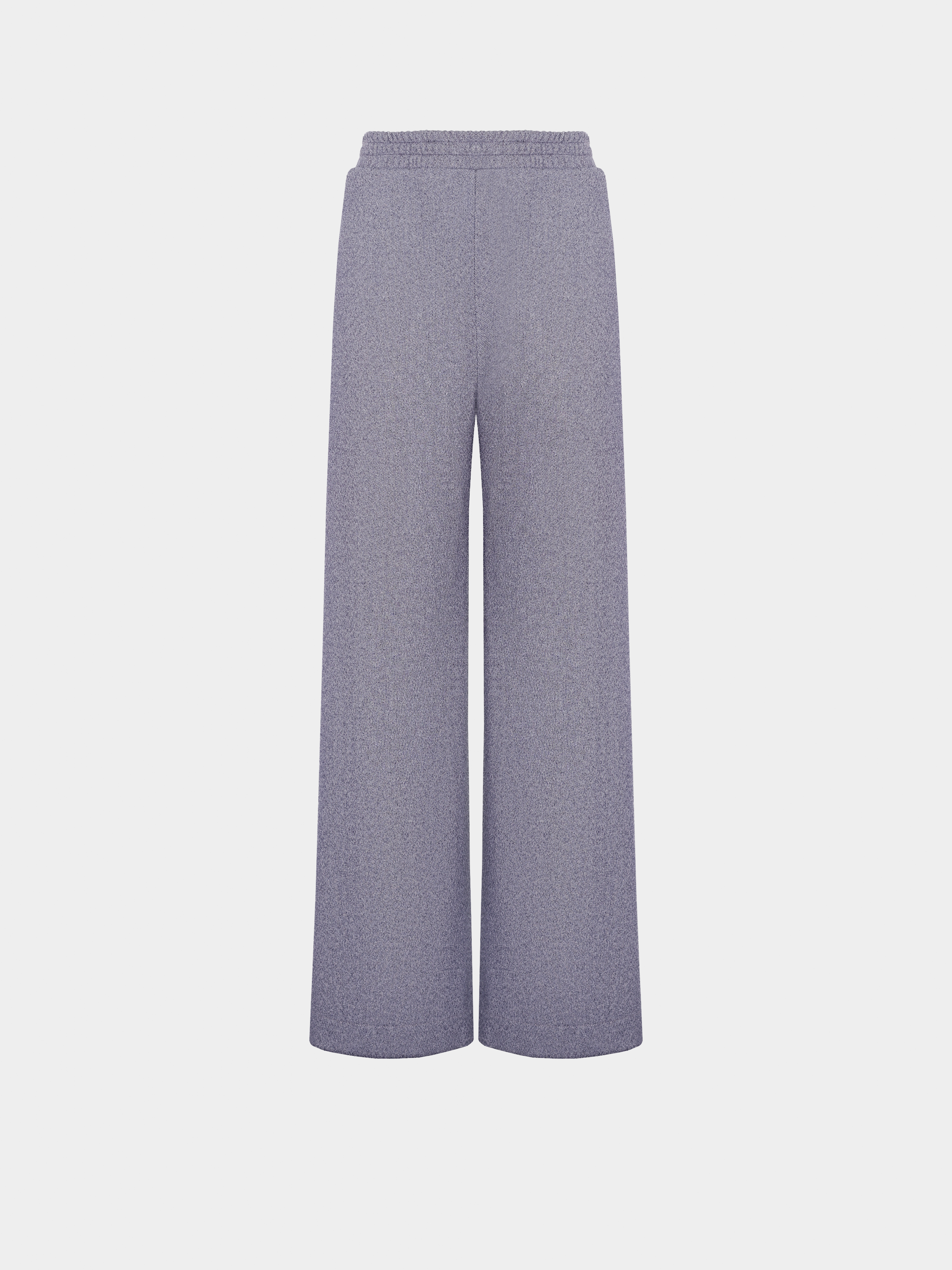 Штани з м'якого теплого синього трикотажу, на резинці з врізними кишенями, прямого крою.