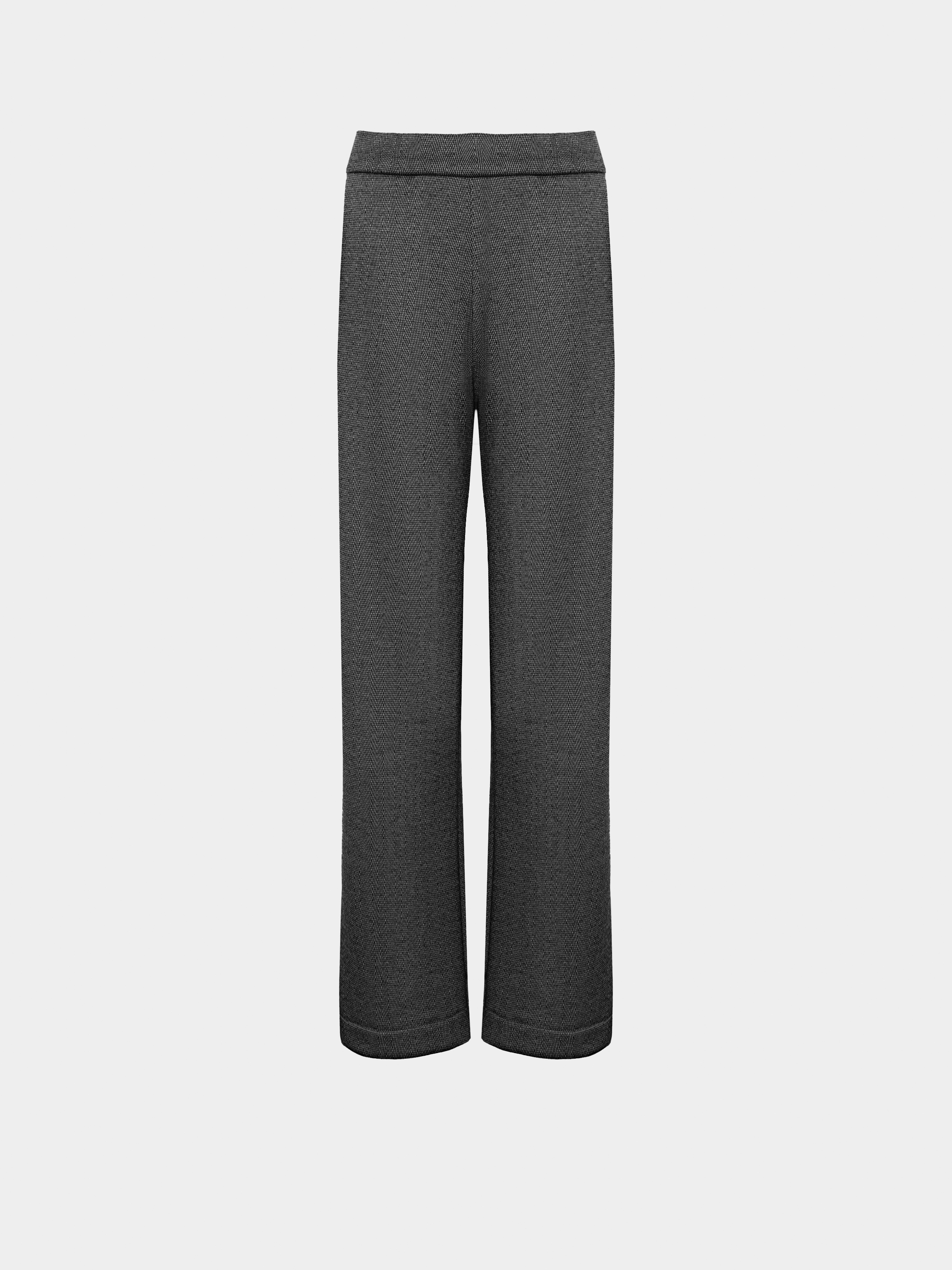 Штани з м'якого теплого графітового трикотажу на хутрі, на резинці з врізними кишенями, прямого крою.