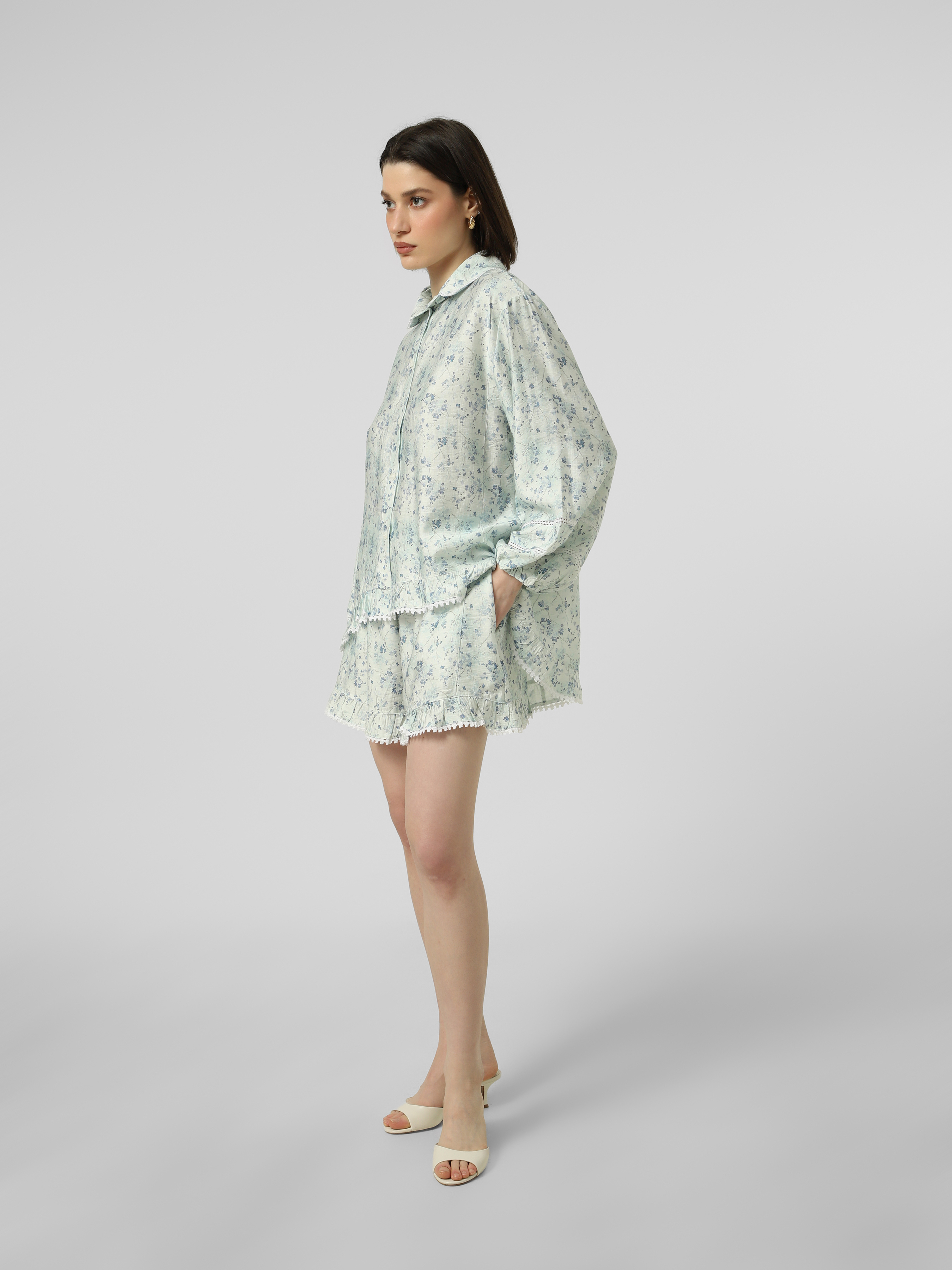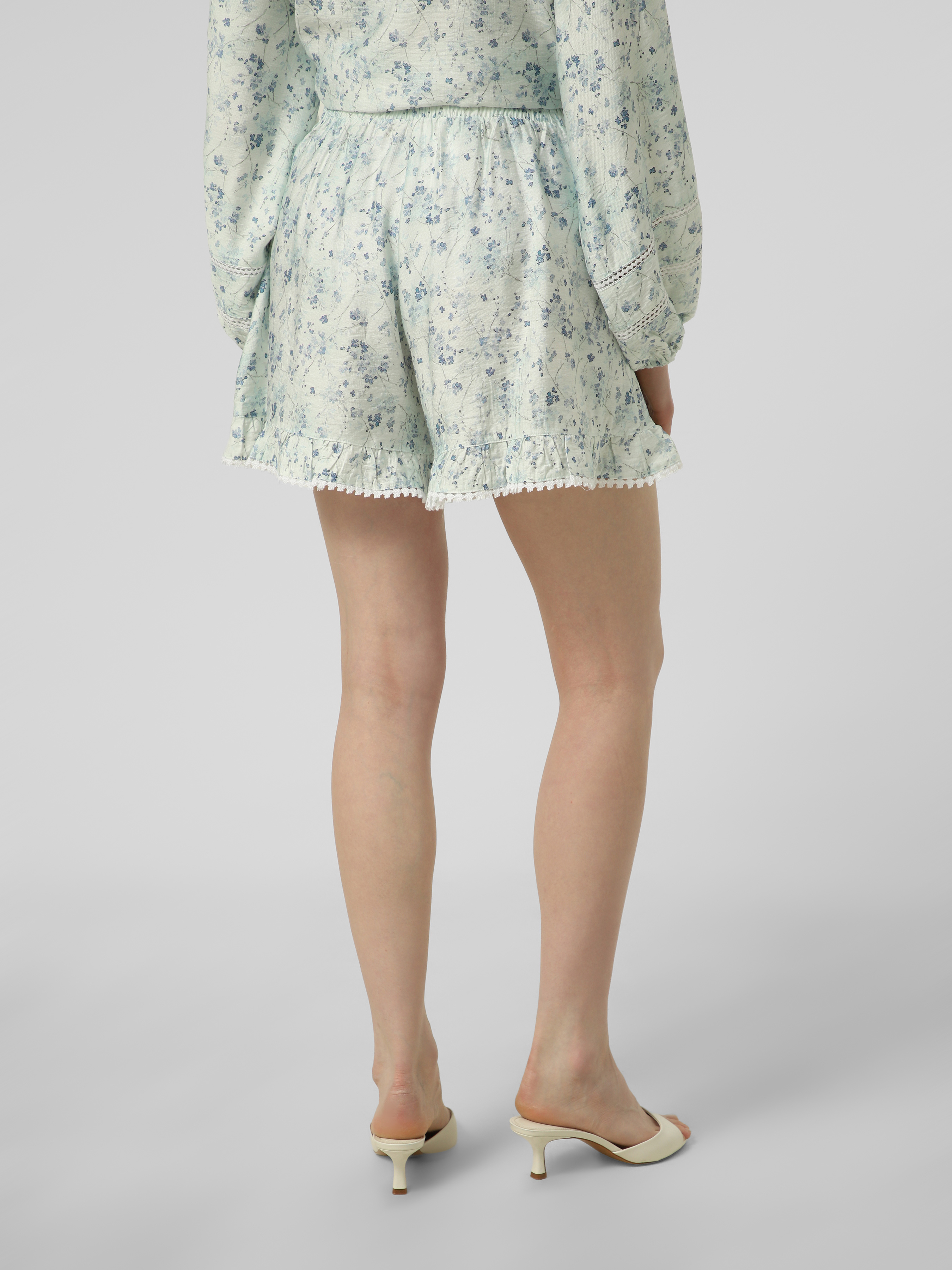 Принтовані шорти з мереживом з віскози, пояс на резинці, кармани в бічних швах.