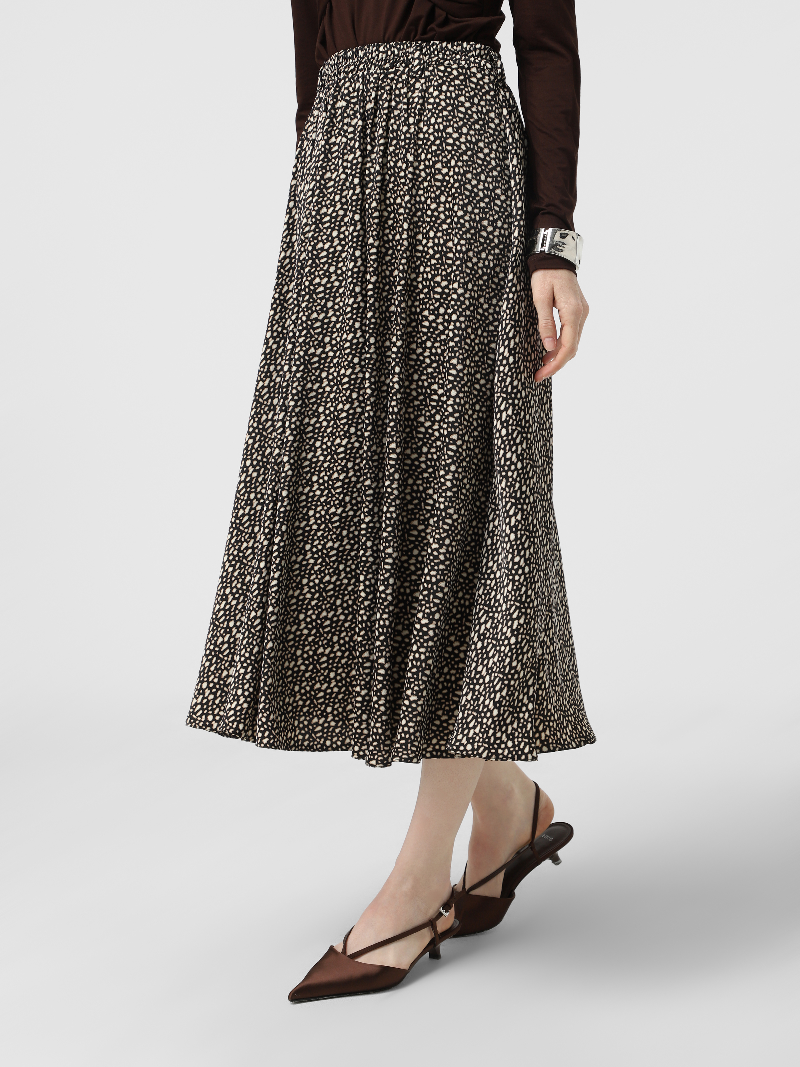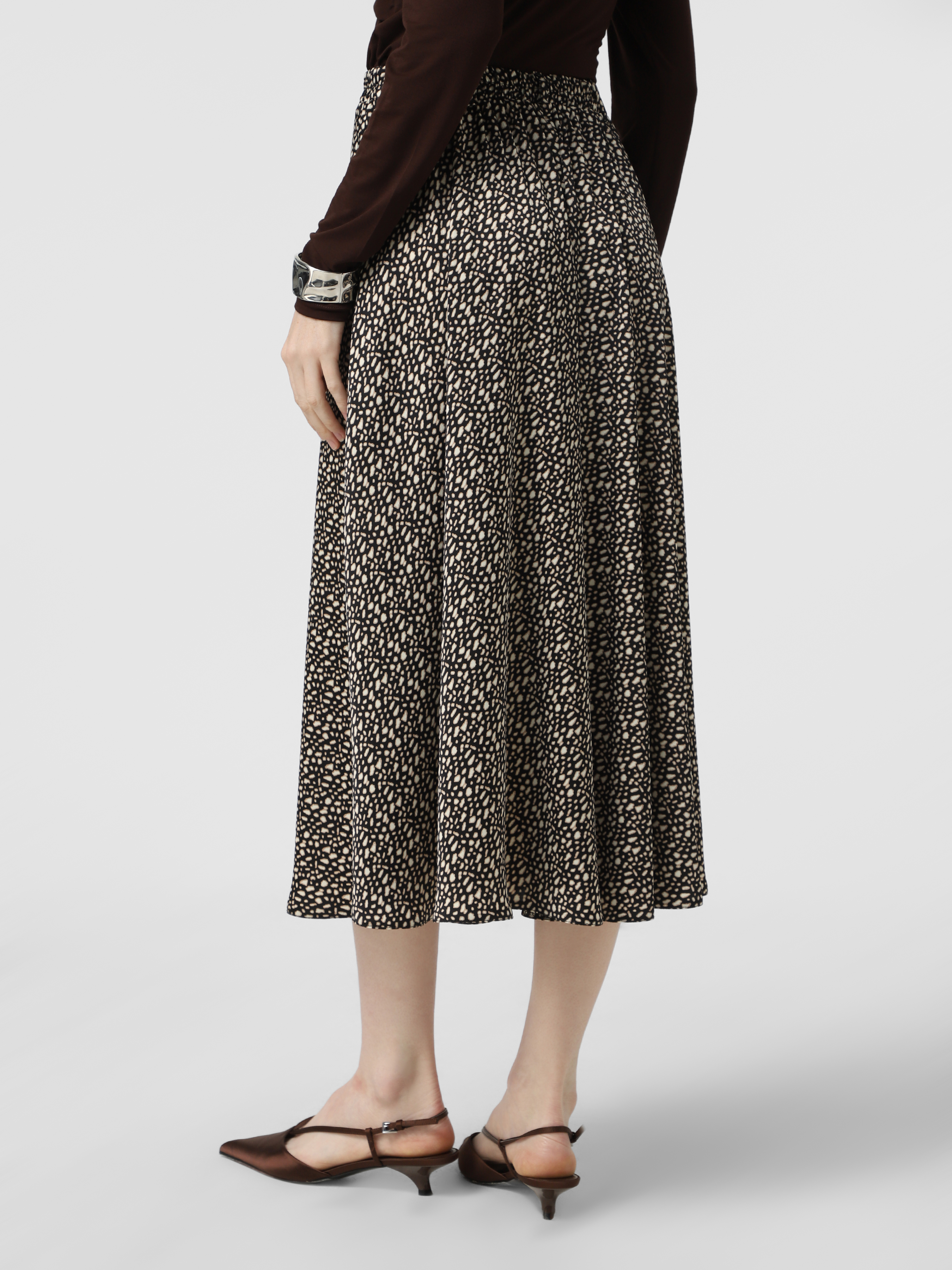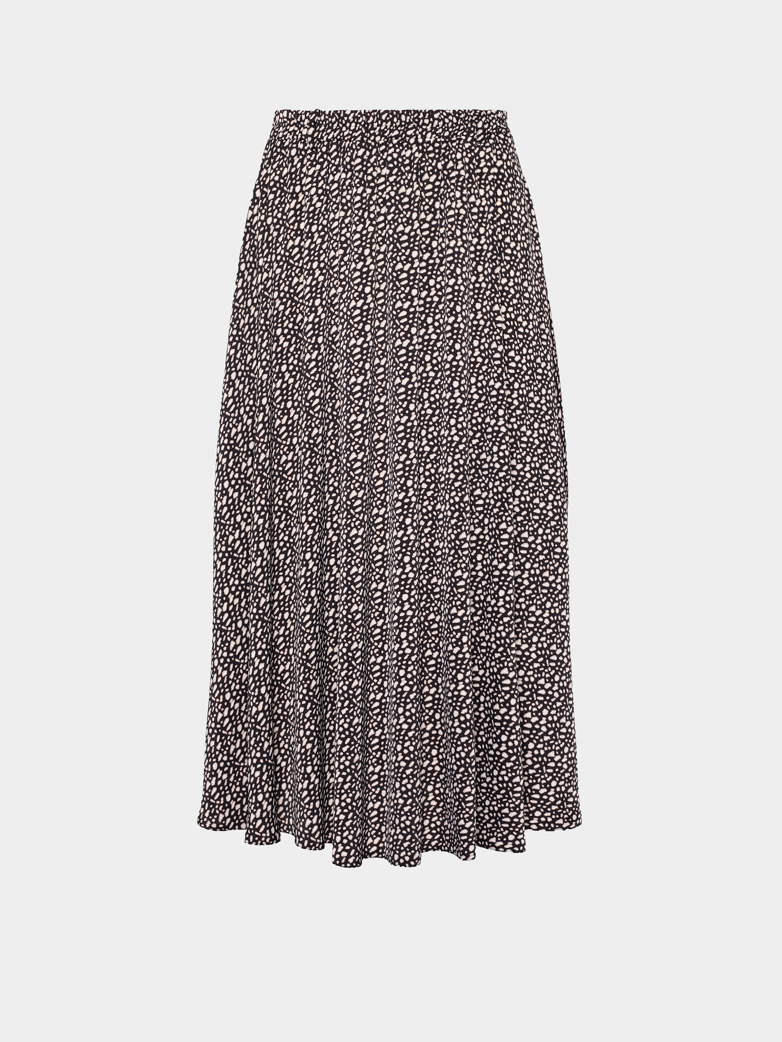 Чорна плямиста спідниця на резинці довжина міді з легкої тканини.